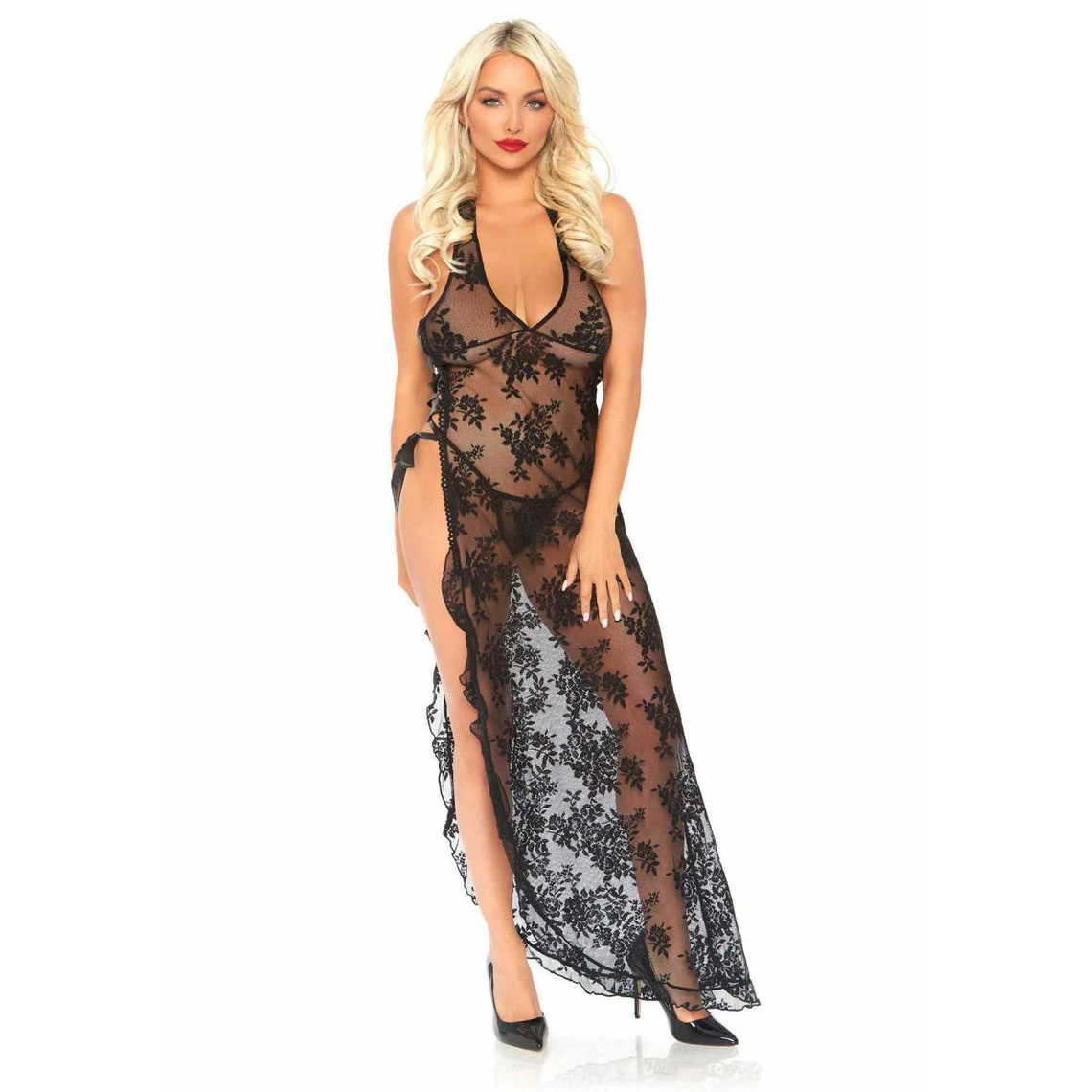 Misant sur la transparence, cet Ensemble 2 pièces robe longue et string Leg Avenue noir est constitué d’une dentelle florale délicate pour sublimer avec sensualité vos courbes féminines.