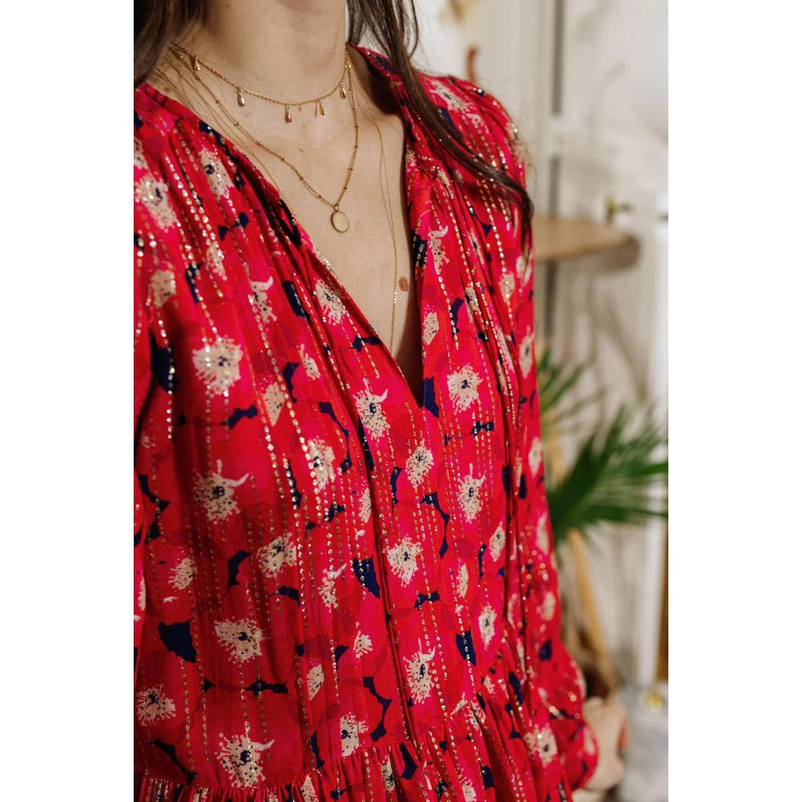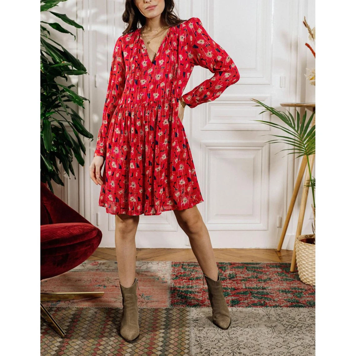 La Robe courte LEONIDE de la marque La Petite Etoile est sublimée par des imprimés floraux sur fond rouge. Elle se démarque par sa coupe classique et fluide, ainsi que ses manches longues et amples. Son encolure est en V.