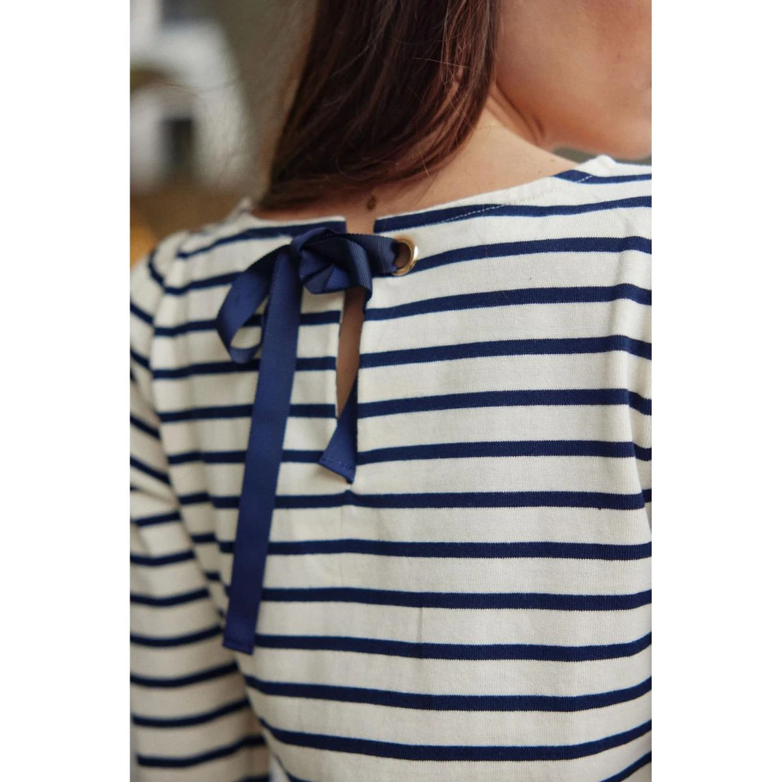 Détails : motif rayé, lien à nouer sur le dos au niveau du col