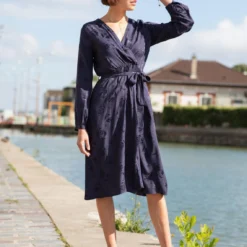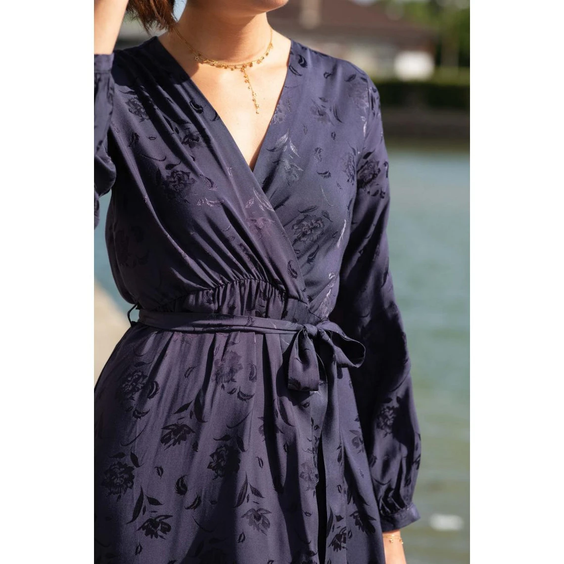 Totalement féminine et resserrée à la taille, cette Robe mi-longue bleue DANA va certainement vous conquérir. On aime particulièrement le motif floral de son tissu et la forme cache-cœur de son encolure.