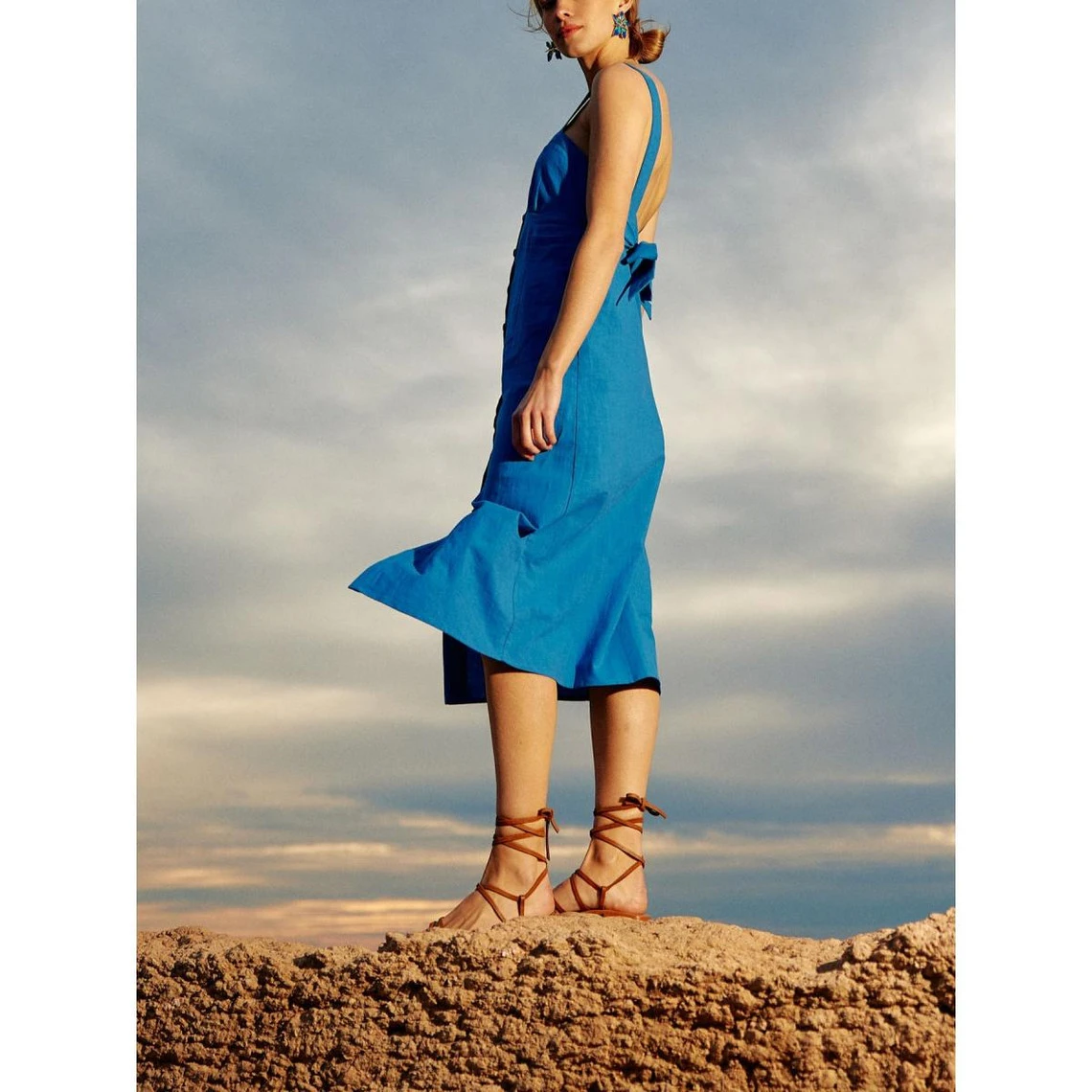 Boutonnée sur le devant, cette Robe Midi SKYLAR séduit par sa couleur bleue très tendance. Elle présente des fines bretelles et une coupe droite classique. Confectionnée en coton, elle se veut confortable et agréable à porter.