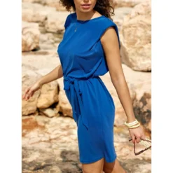 Simple et chic, cette Robe SERENITE est un basique à posséder. On aime sa coupe droite classique et sa ceinture à nouer à la taille. Elle reste sans manches et propose un col rond ras-du-cou.