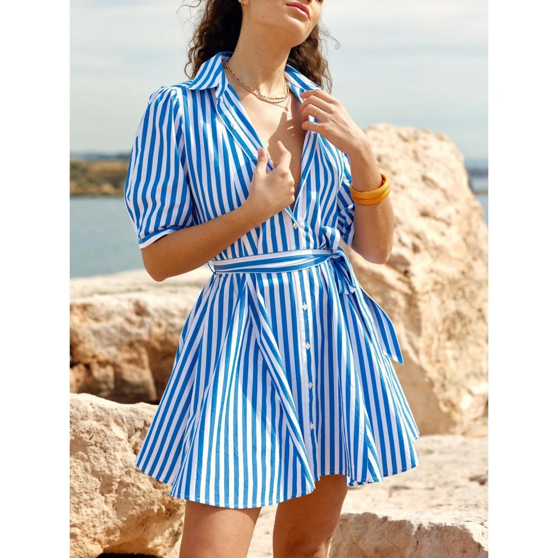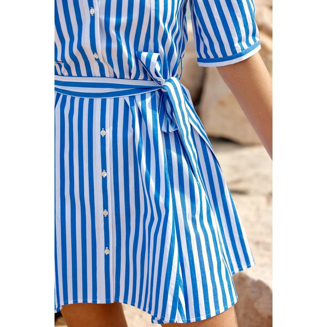 Courte et magnifiée par des rayures, cette Robe SHARHON réunit manches 3⁄4 et col chemise. Boutonnée à l’avant, elle est marquée par une ceinture en tissu à nouer à la taille.