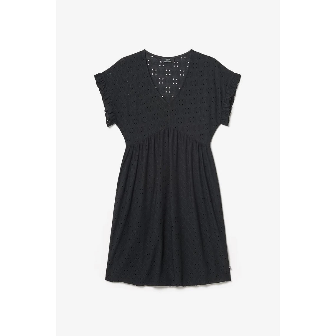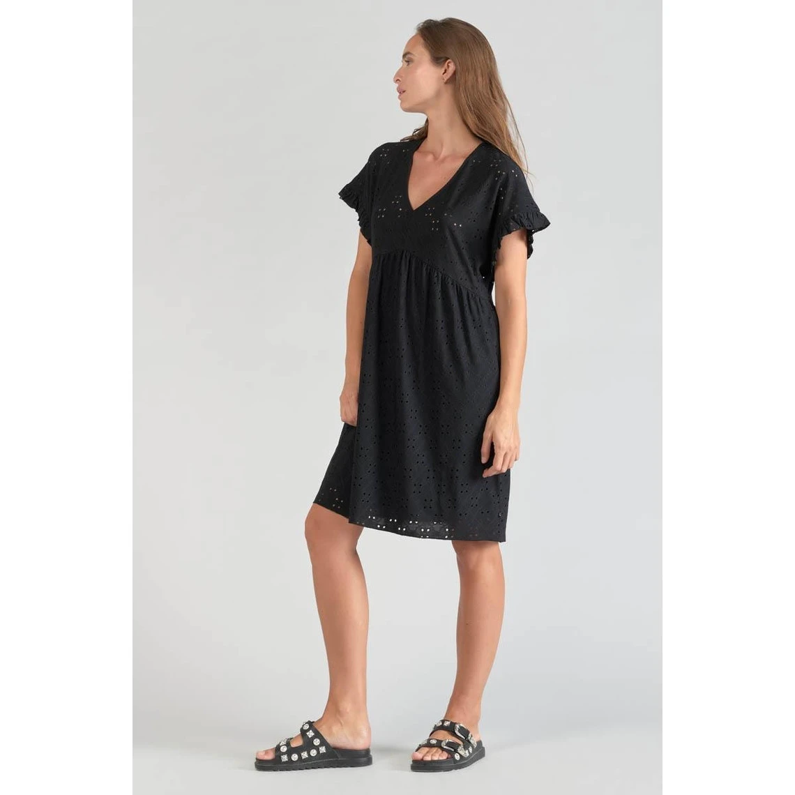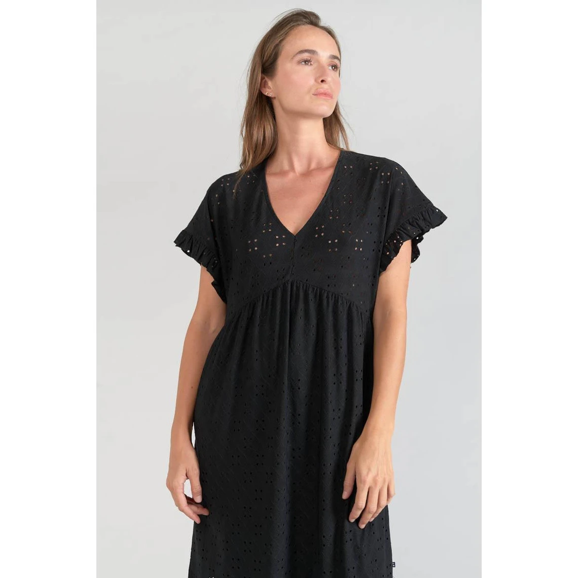 Cette robe Lia est très élégante avec son jersey noir à l’effet broderie anglaise pour donner un effet dentelle, son col V et ses volants en bas de manches. Pour plus de confort, la robe est doublée sur la partie basse.