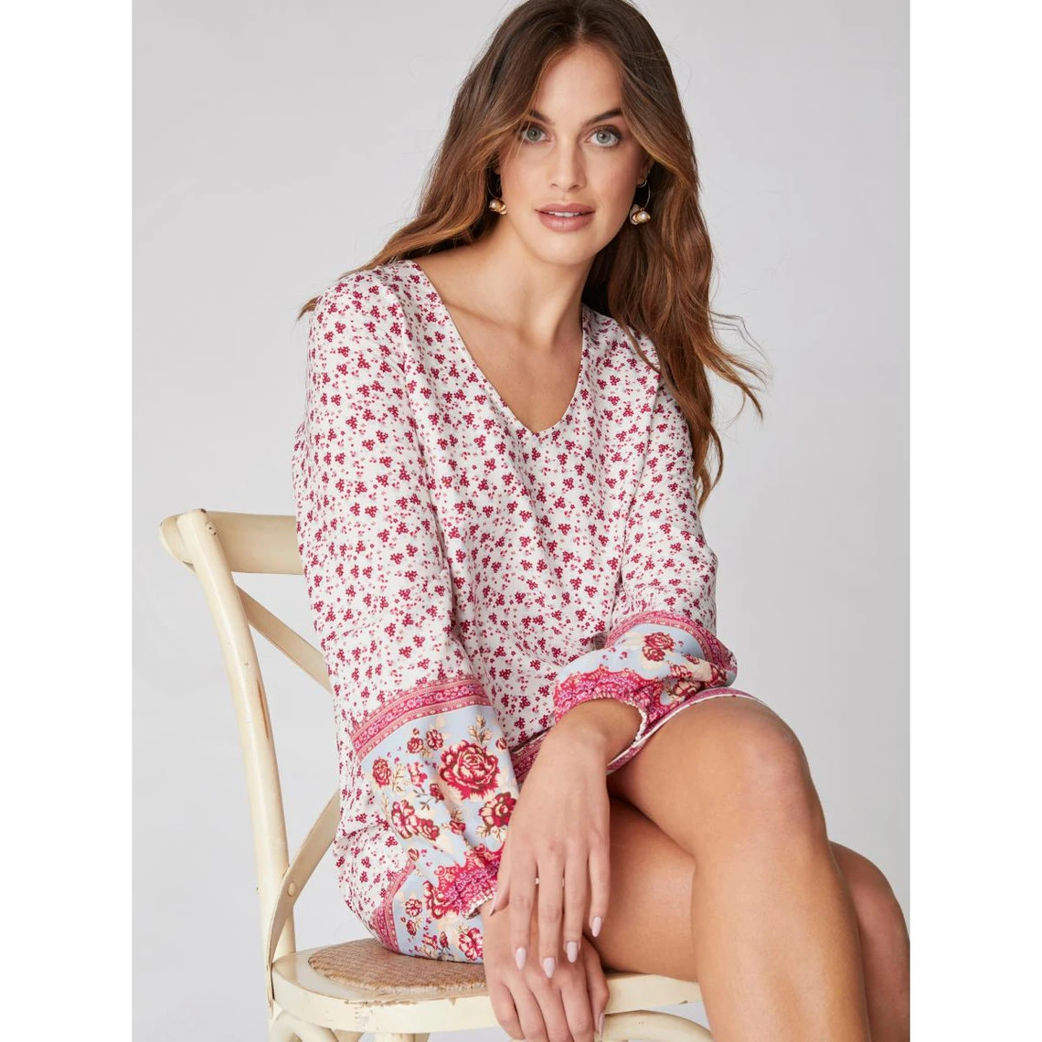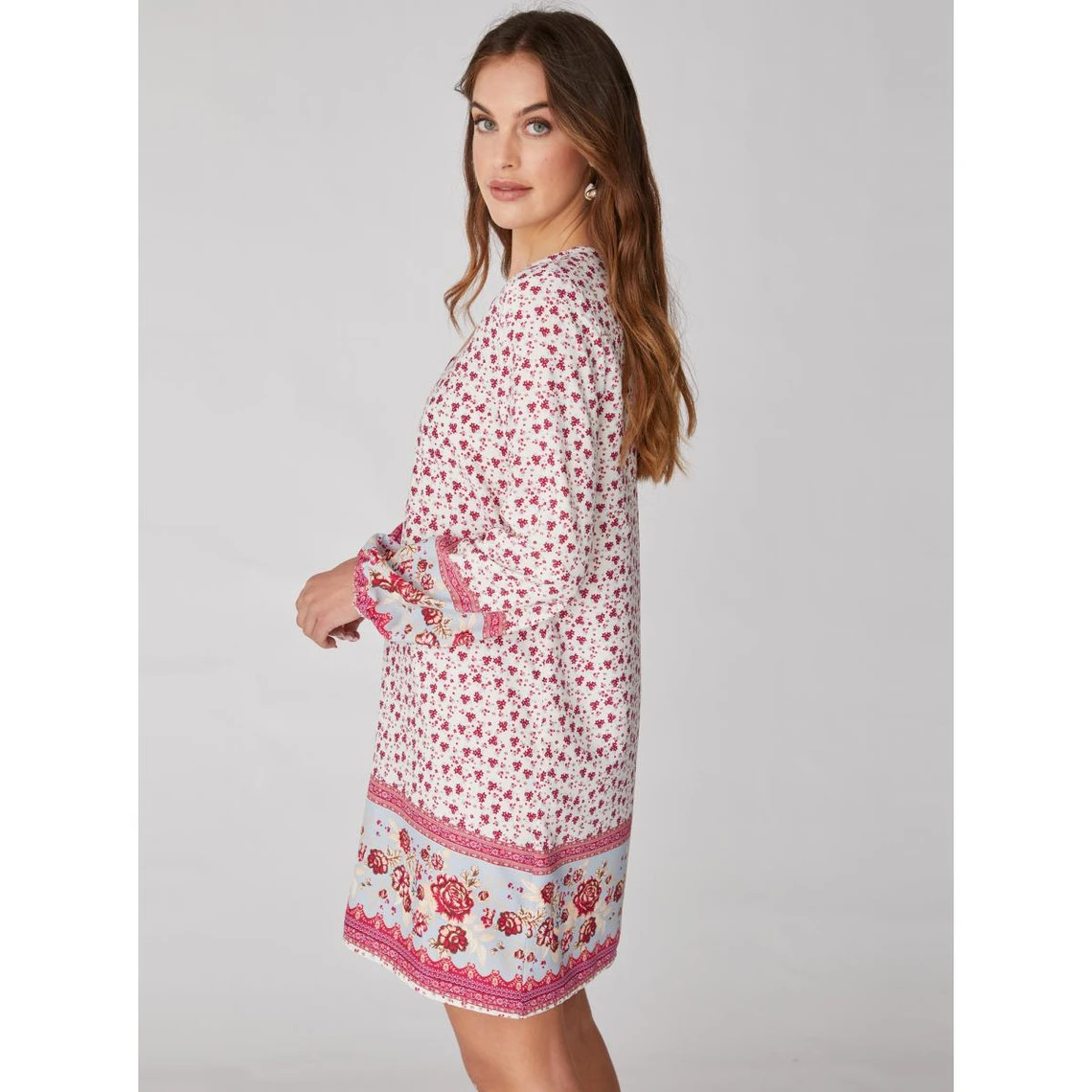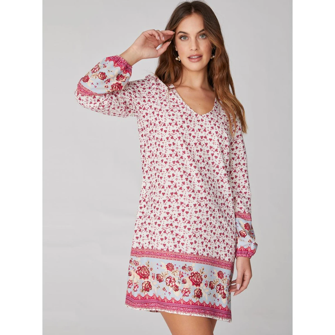 Robe féminine et coquette. Imprimé à petites fleurs et frise fantaisie au bas de la robe et aux poignets. Extrêmement seyant, ce modèle aide à sculpter la silhouette. Décolleté en V Manches longues