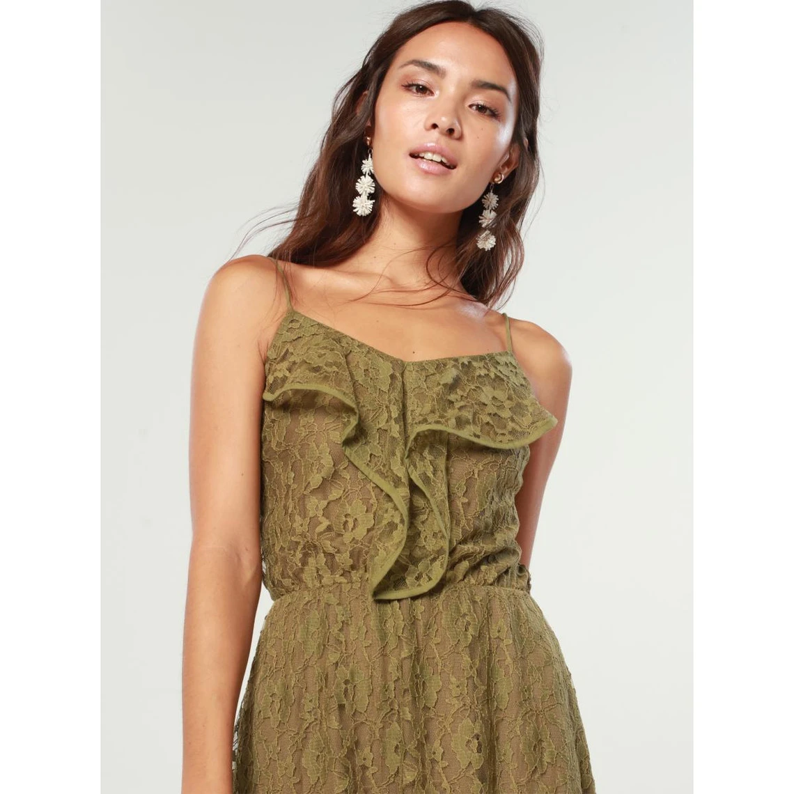 Col en V devant et tout droit derrière Fines bretelles spaghetti Roue avant dans le décolleté Pinces sur poitrine. Couture élastique de la ceinture Un rayon de miel au dos Doublure. Tissu de de