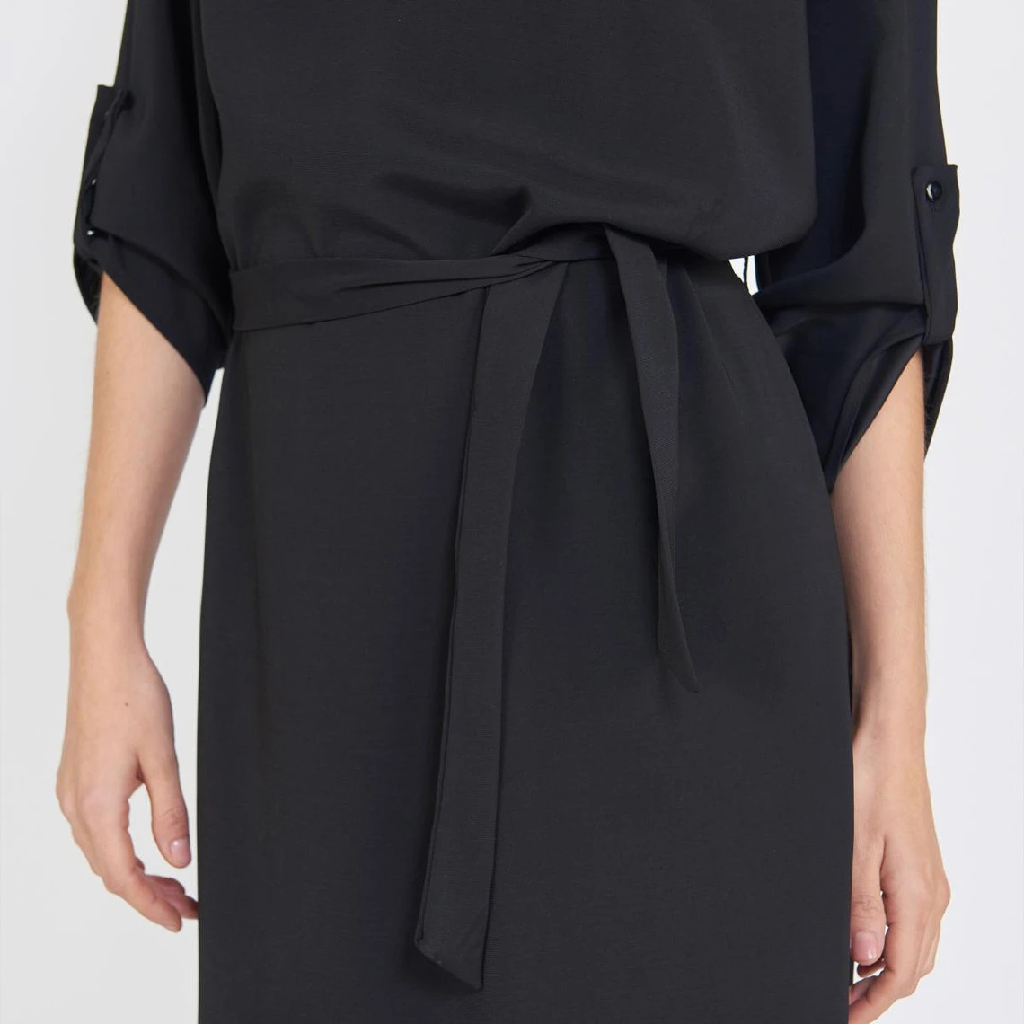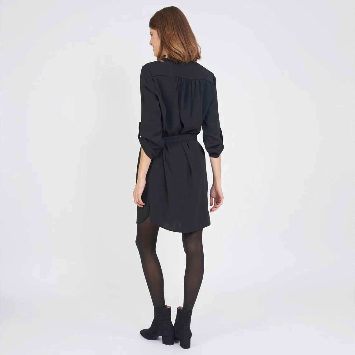 Robe courte droite, ceinturée à la taille.