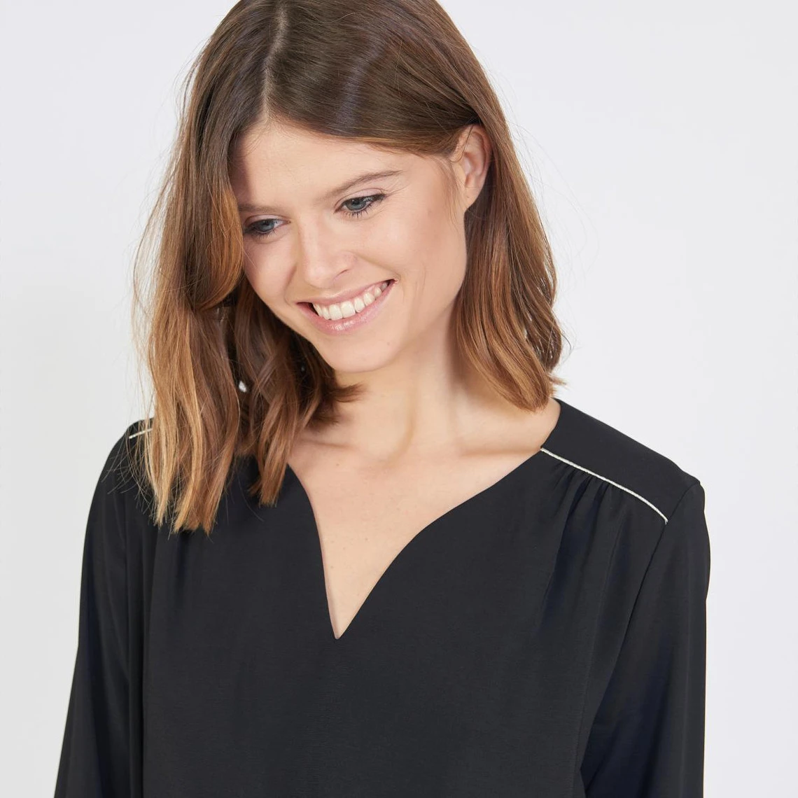 Détail lurex aux épaules, manches retroussées par une patte de boutonnage.<br
