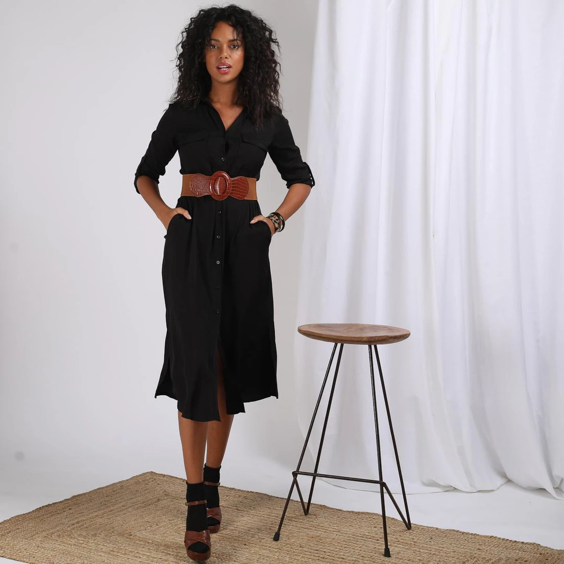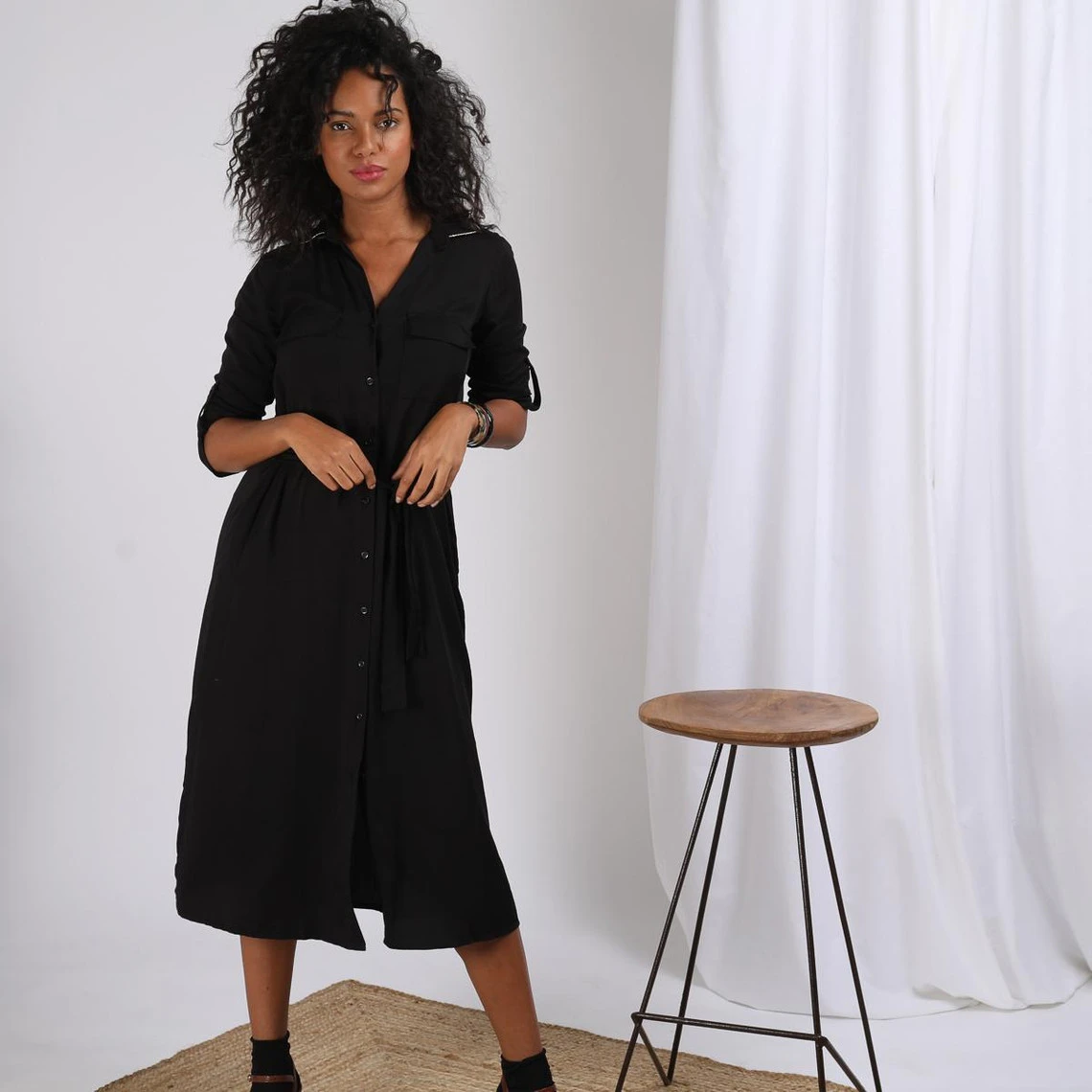Robe chemise fluide ceinturée, boutonnée devant et fendue sur le coté.