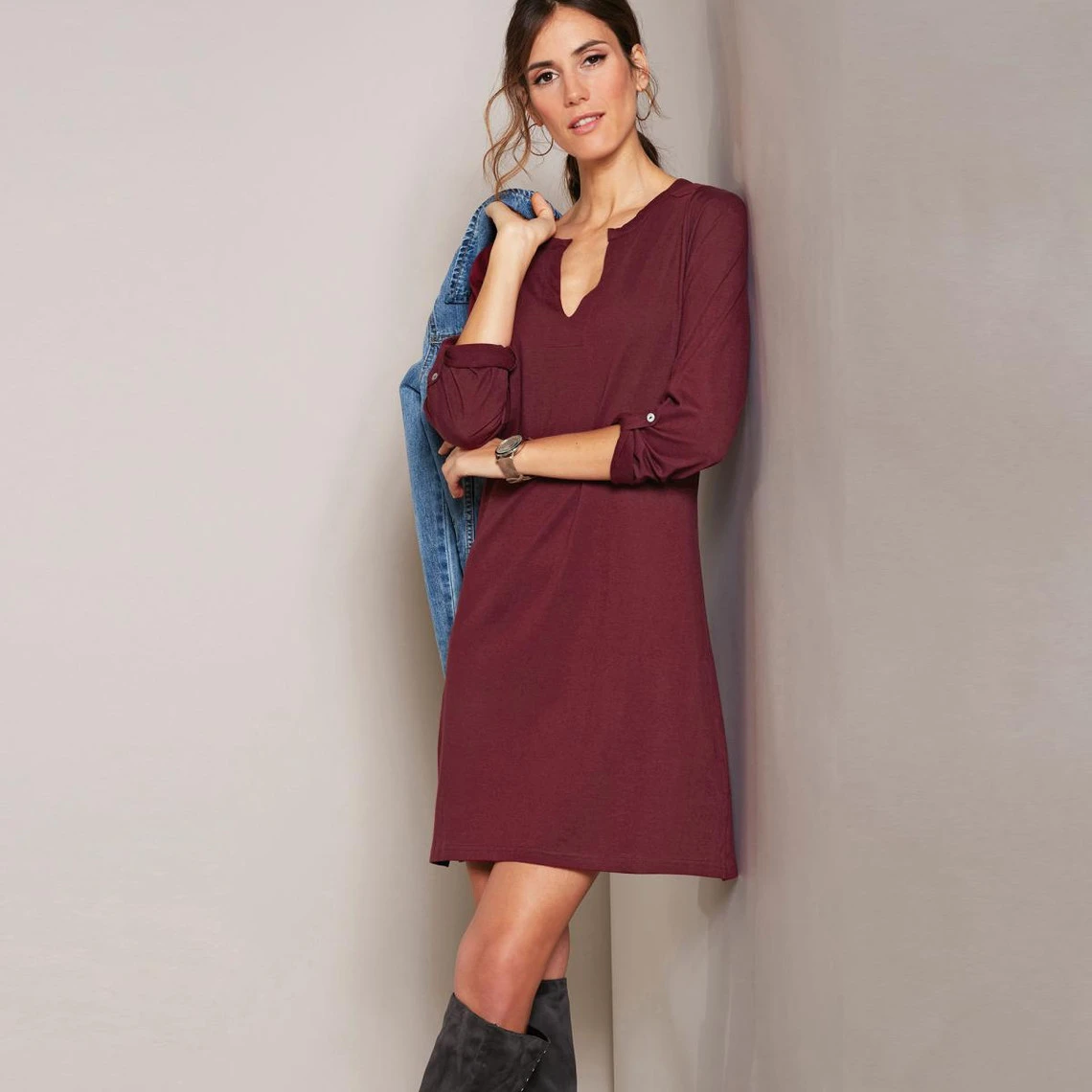 Robe courte. Encolure caftan. Manches longues ajustables par pattes et boutons en nacre. Empiècement dos avec pince. Fendue sur les côtés. Maille jersey. Longueur 90 cm environ.