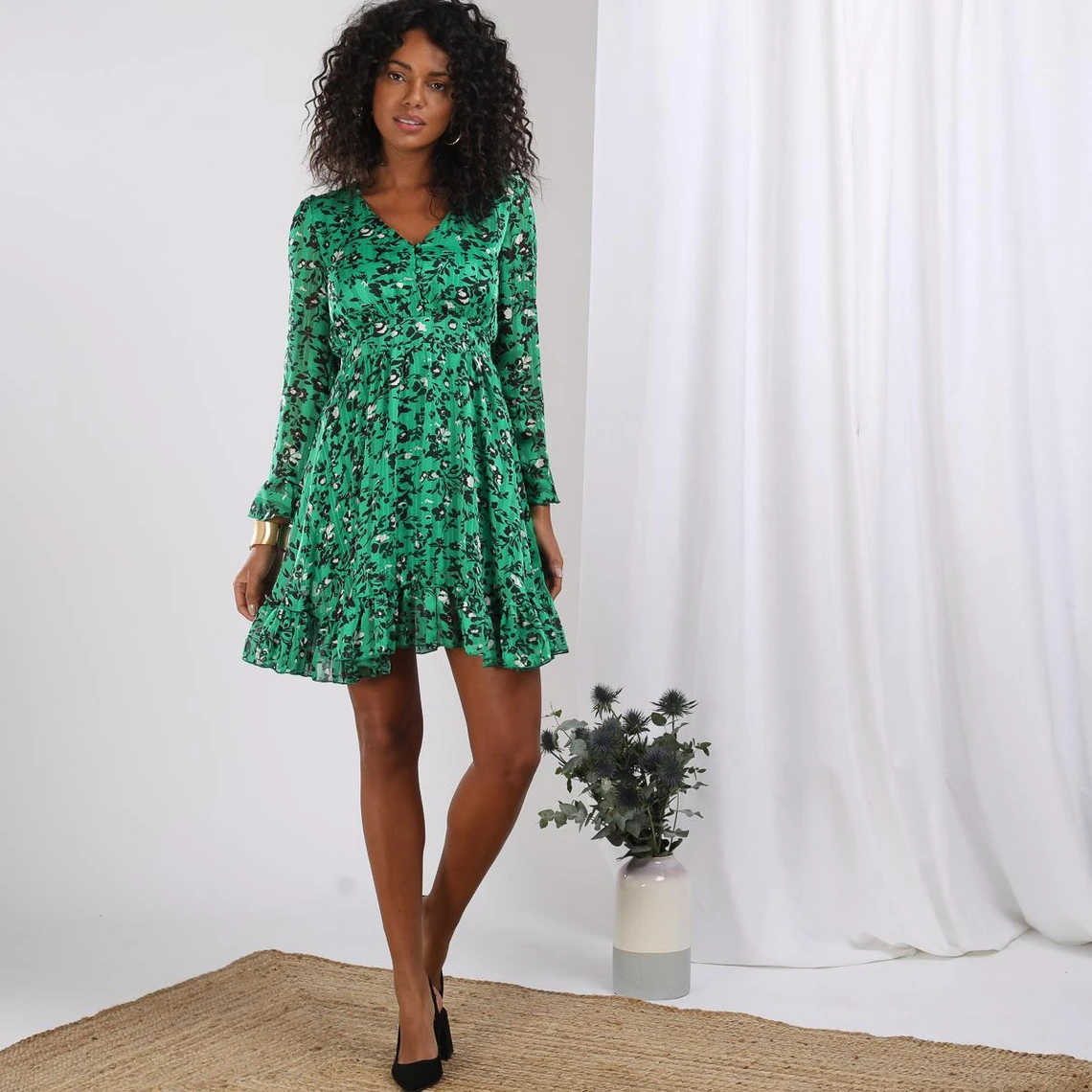 Robe courte fluide à volants, ajustée à la taille, manches longues.