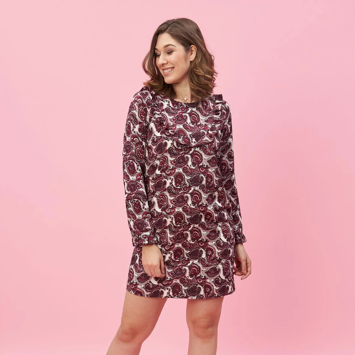 Robe. Encolure arrondie. Volants froncés à l’encolure et aux poignets. Manches longues. Pinces sur poitrine. Fermeture éclair invisible dans le dos. Doublure. Imprimé d’inspiration cachemire. Tissu agréable. Longueur 90 cm environ.