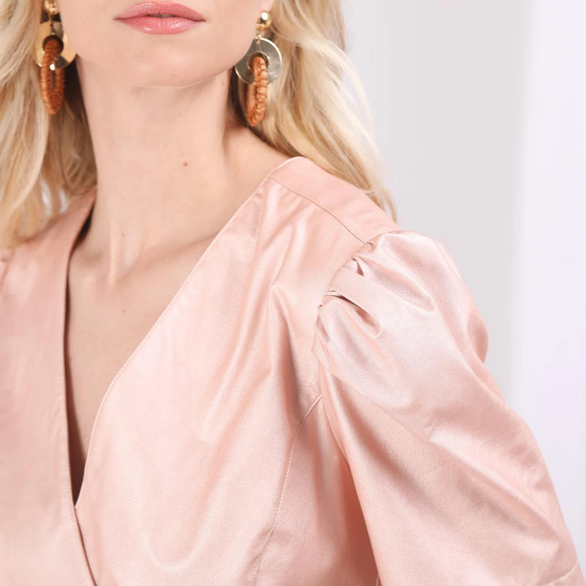 Robe manches courtes portefeuille en simili cuir irisé rose pâle.