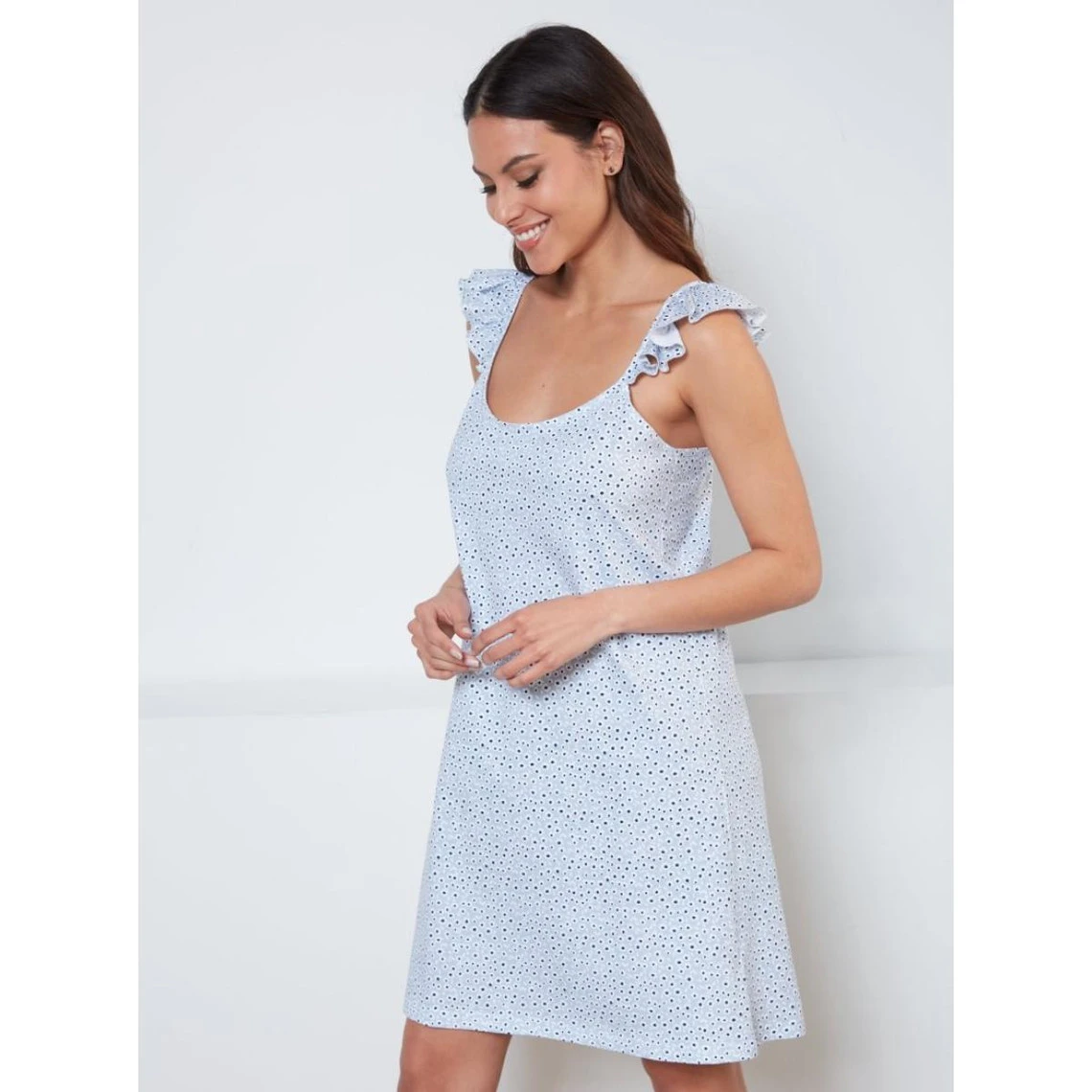 Une chemise de nuit à bretelles imprimée de petites fleurs, au design coquin, avec un détail de volants froncés sur le devant et une pièce de réglage au dos pour votre plus grand confort.