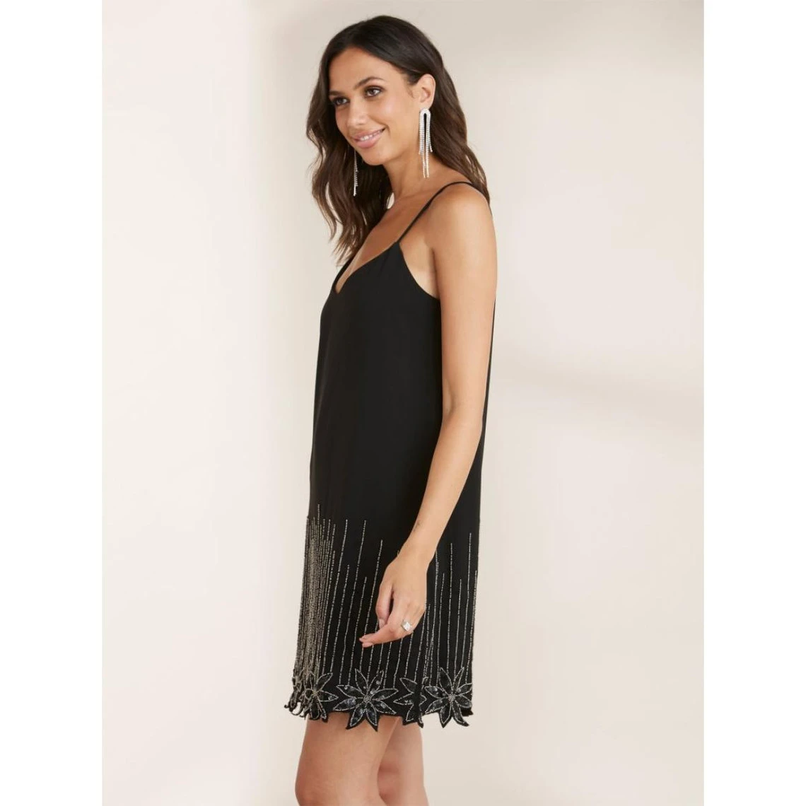Spécial fête Top débardeur Col en V devant et derrière Paillettes sur l’ourlet Entièrement doublé Doublure 100 % polyester Tissu agréable à porter 100 % polyester. Longueur approx. 90 cm (T