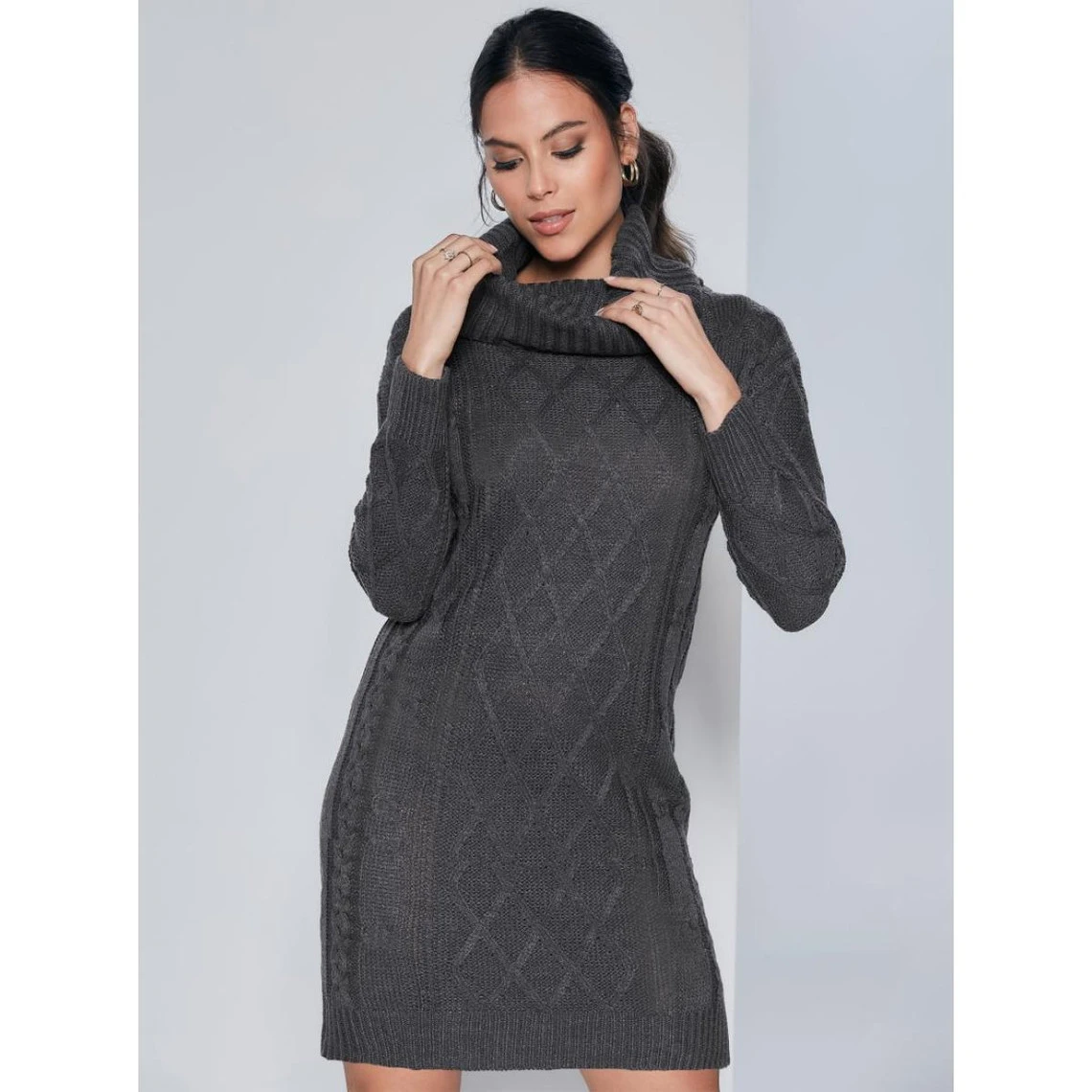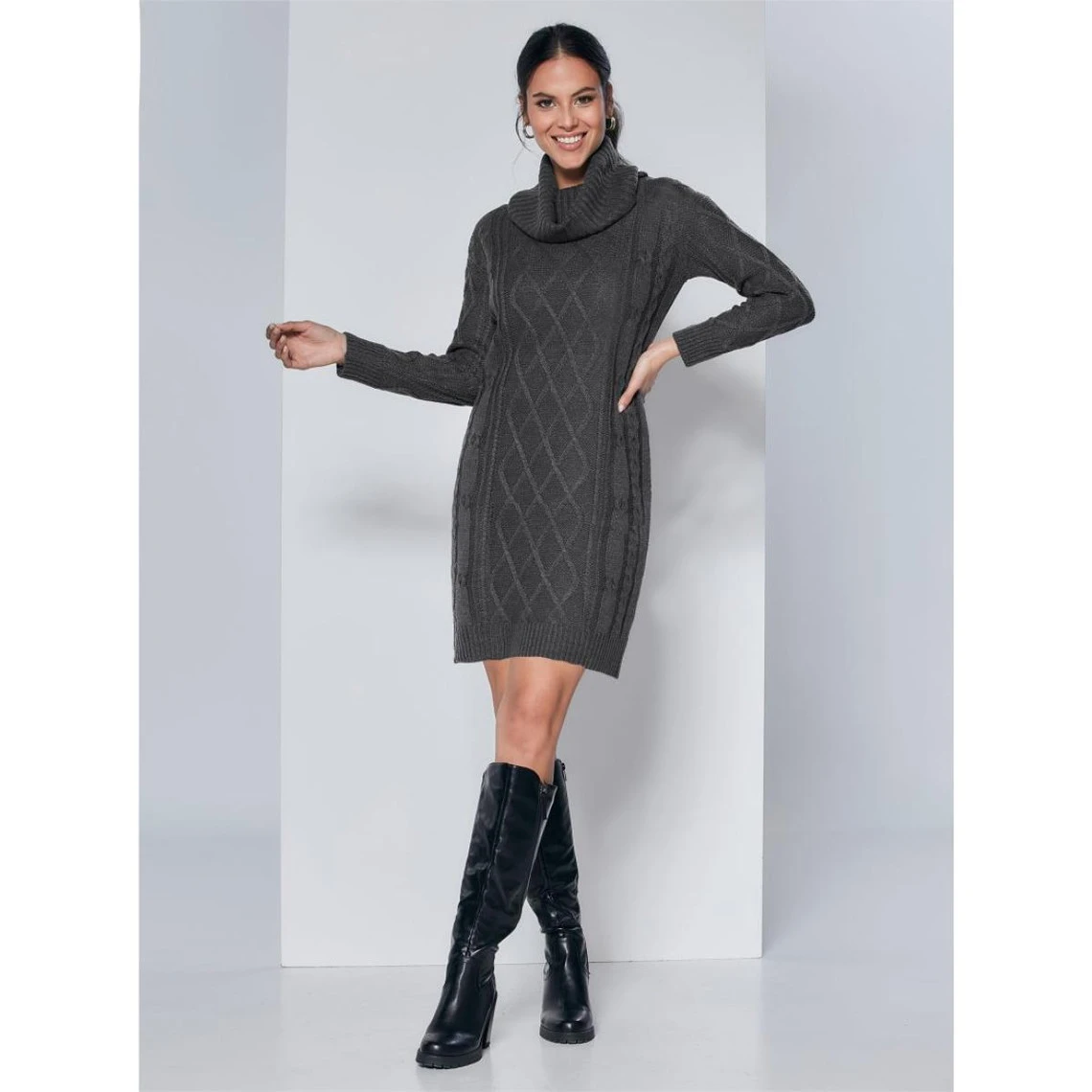 Col rabattu Manches longues Côtes aux poignets et à la base. Motif de tresse sur le devant et les manches Tricot agréable 100 % acrylique ongueur 86 cm environ. (Traduction Automatique)