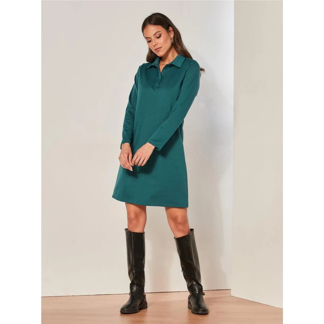 Col chemisier Fermeture par boutons Manches longues Bas droit Adaptable, maille Milano élastique 95 % polyester, 5 % élasthanne Longueur 90 cm environ. (Traduction Automatique)