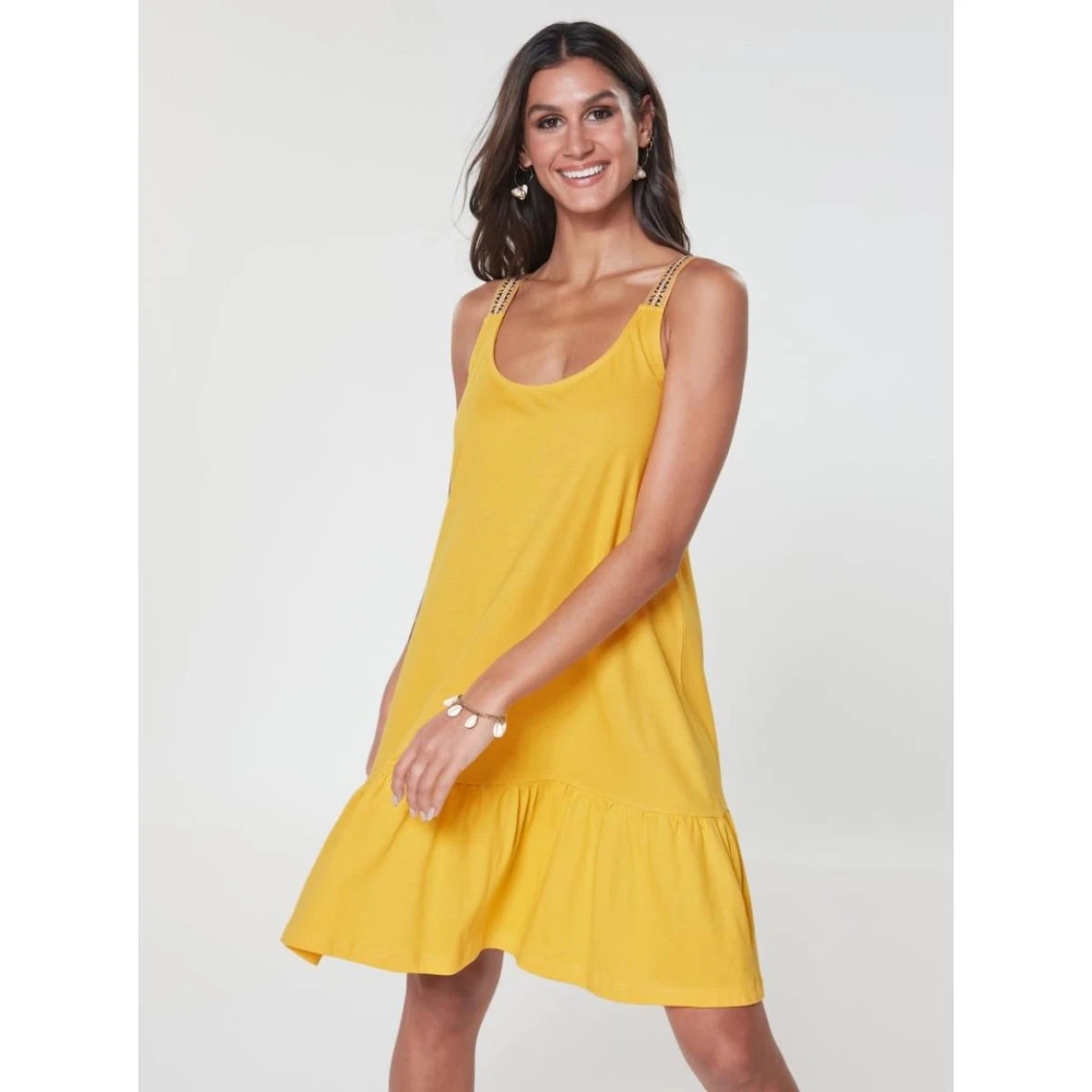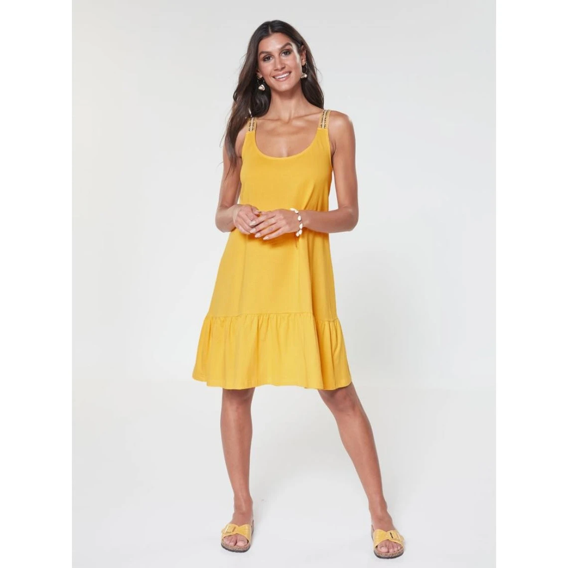 Forme évasée Top débardeur Passementerie sur les bretelles Encolure arrondie devant Encolure carrée dans le dos Volant à la base Point de jersey tout en douceur 100 % coton ongueur : 90 cm en