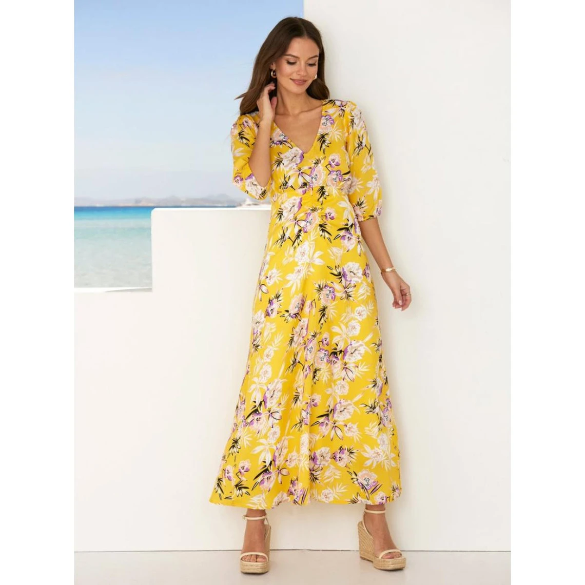 Décolleté en V Pinces sur poitrine. Fermeture éclair invisible dans le dos. Manches 3/4. Poignets élastiqués. Pincement d’épaule Robe fendue de la taille jusqu’au bas Effet froncé sur le devant