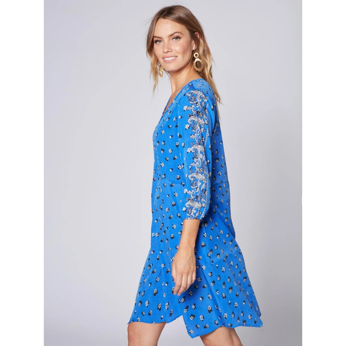 Décolleté en V Manches 3/4. Poignets élastiqués. Robe fendue de la taille jusqu’au bas Poches latérales Bas asymétrique. Imprimé positionnel sur les manches Tissu agréable à porter 100 % polye