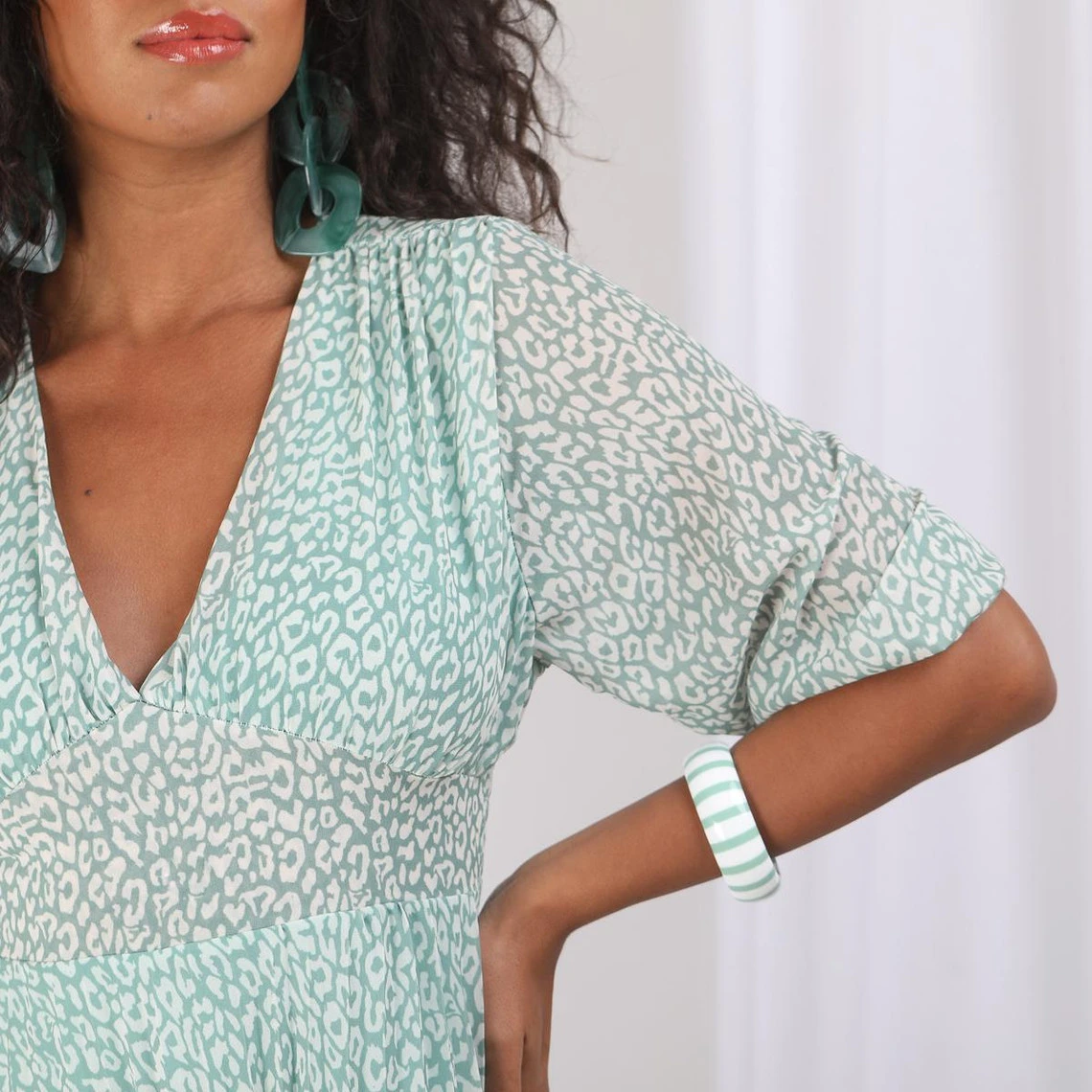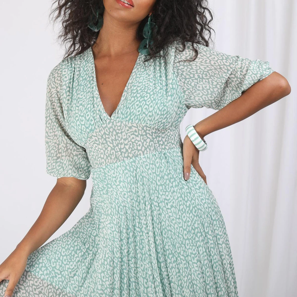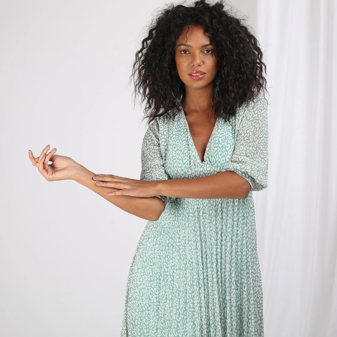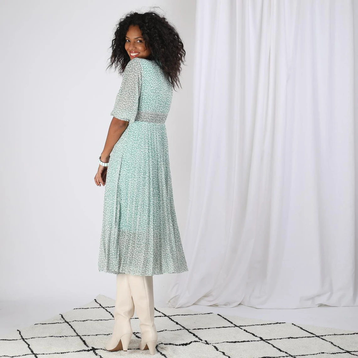 Robe longue plissée midi, resserrée à la taille, col V, manches courtes fluides.