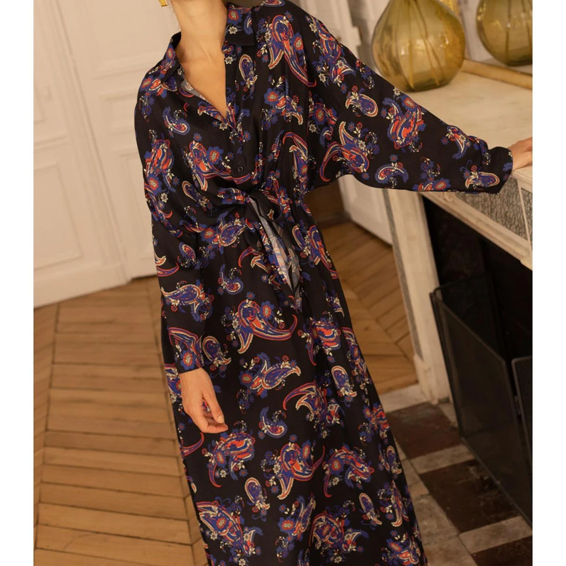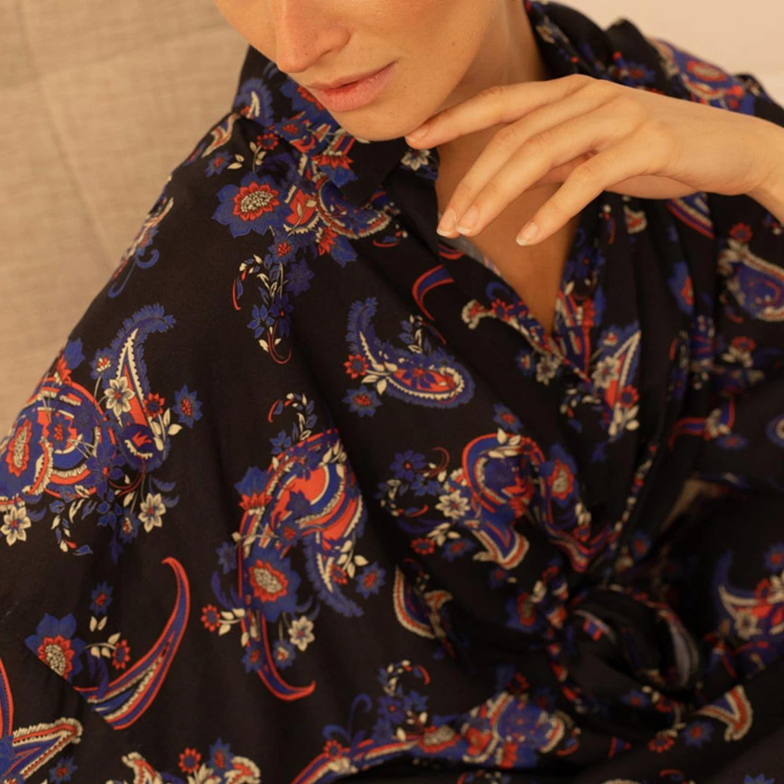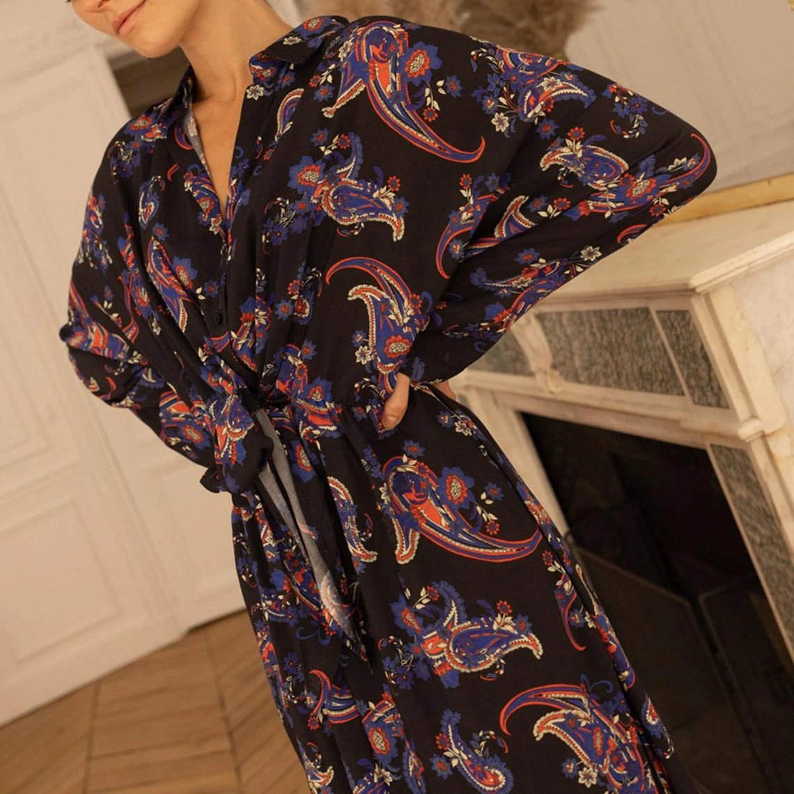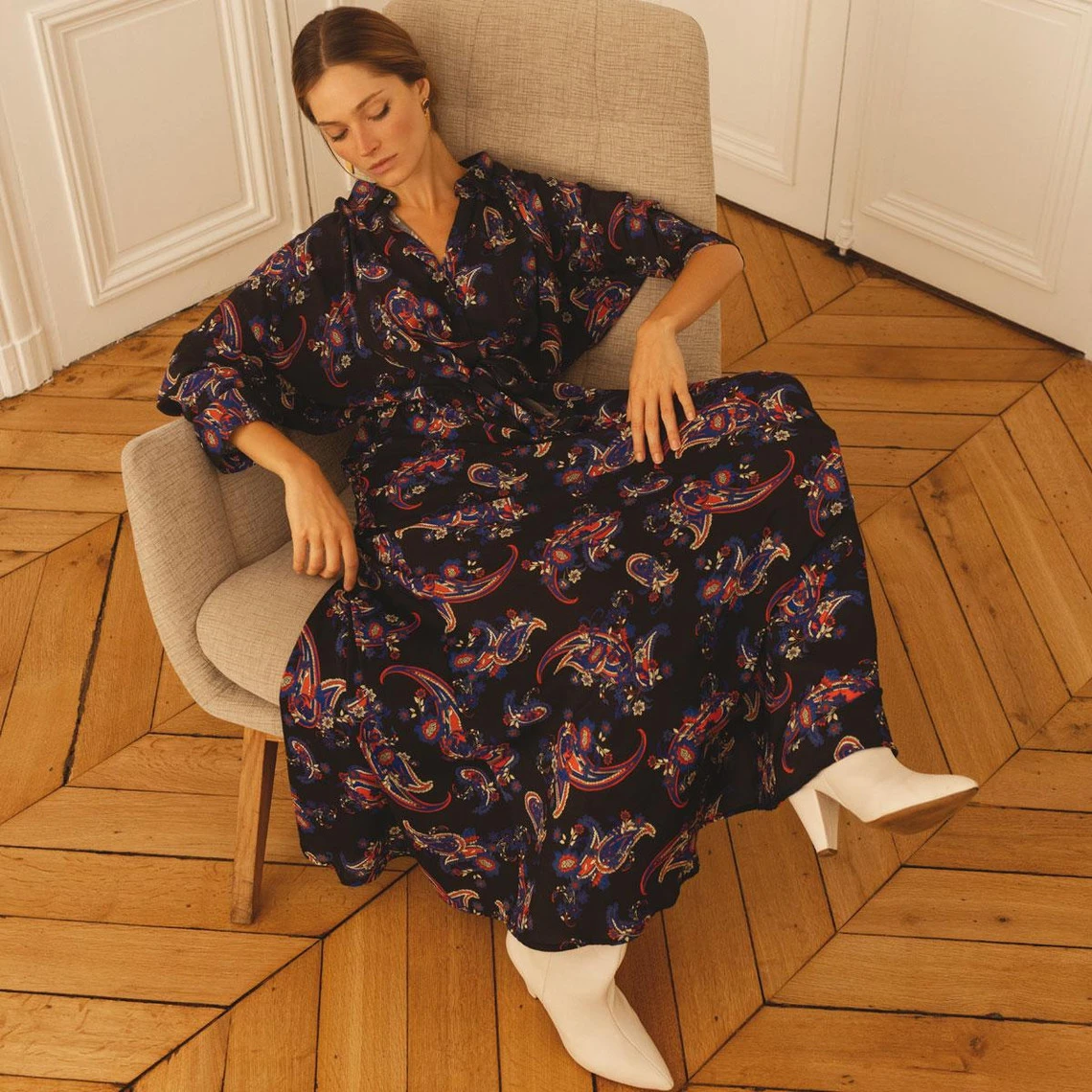 A la fois chic et élégante, laissez-vous séduire par la robe longue Roman et le charme de son imprimé cachemire aux couleurs flamboyantes. Votre silhouette sera sublimée par la fermeture croisée qui dessine la taille avec le détail de deux boutons subtilement placé. Légère et vaporeuse, cette robe longue est un concentré de féminité.