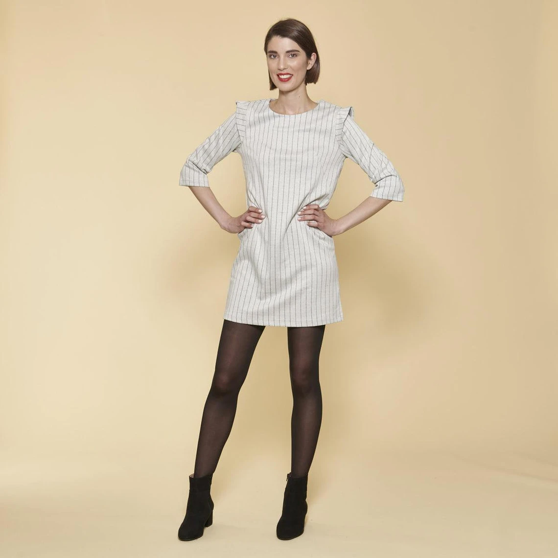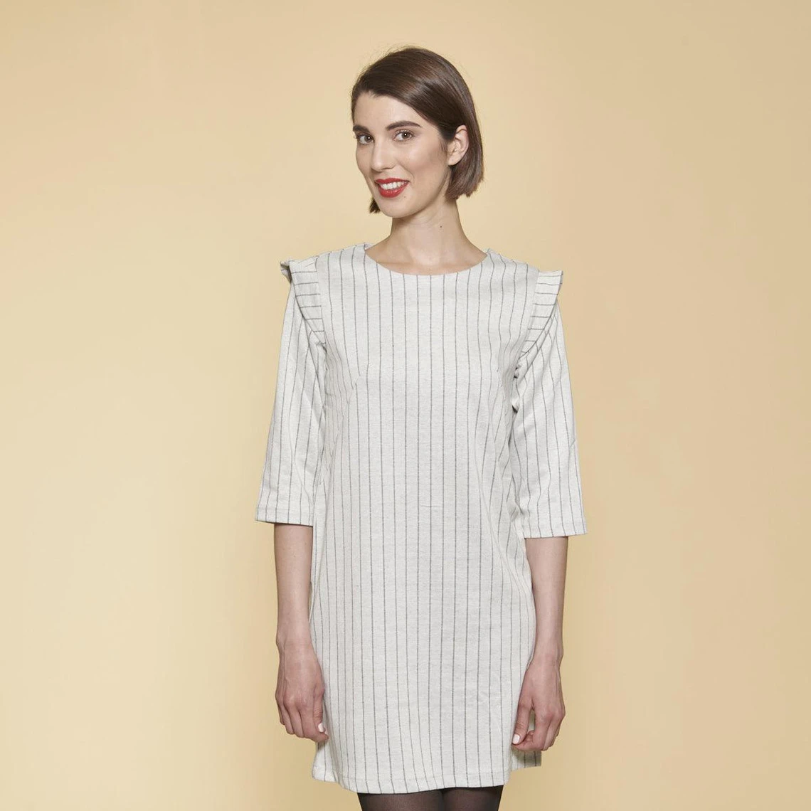 Robe. Encolure arrondie. Manches 3/4. Volants sur les épaules. Pinces sur poitrine. Ouverture goutte d’eau dans le dos fermée par bouton. Rayures tissées. Maille milano. Longueur 88 cm environ.