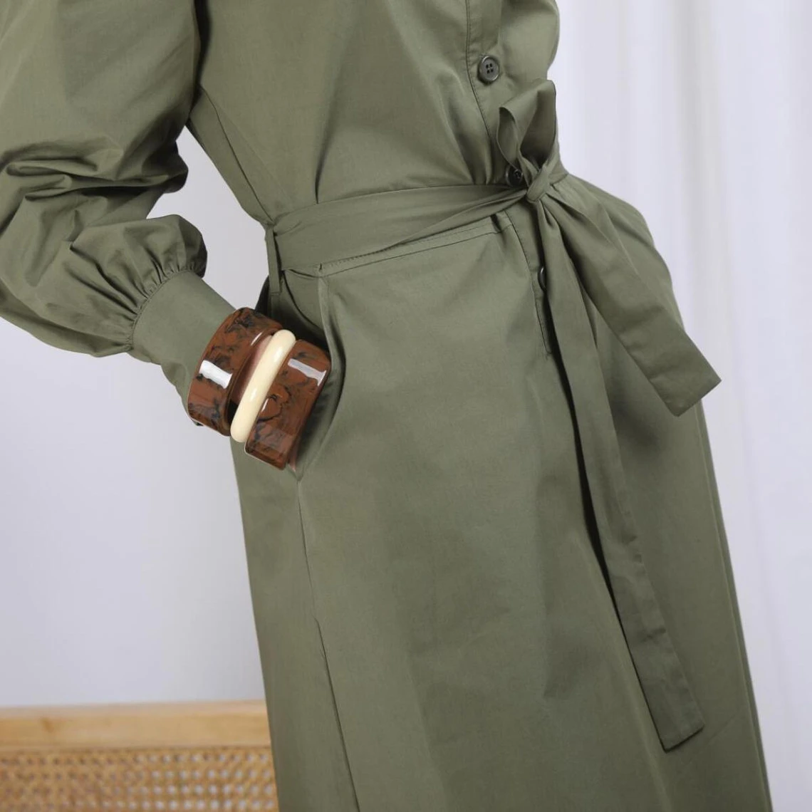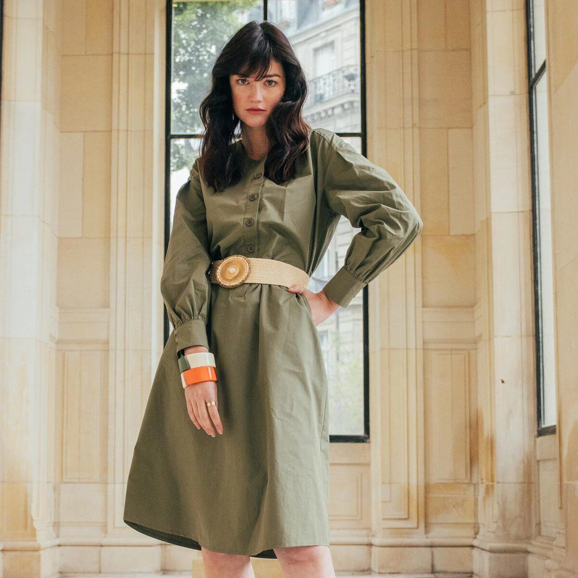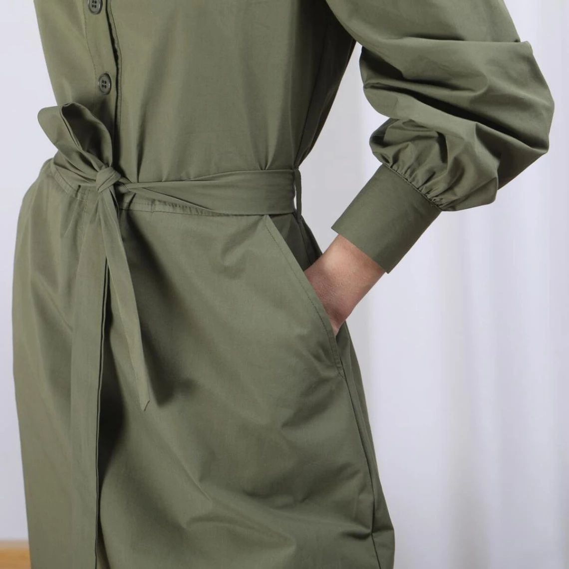 Robe manches longues en popeline coton, ceinture en tissu à nouer, longueur sous genoux.