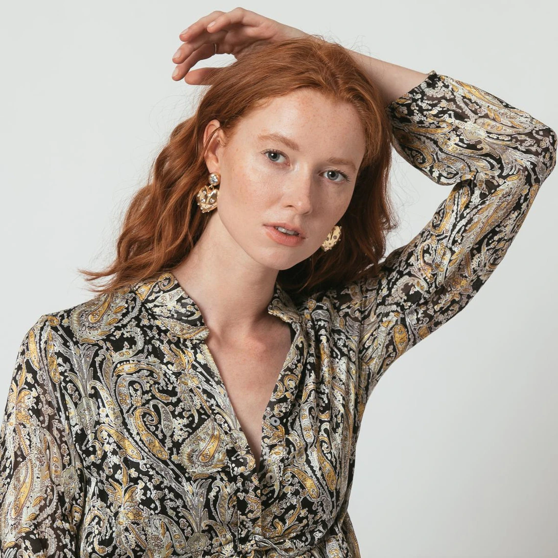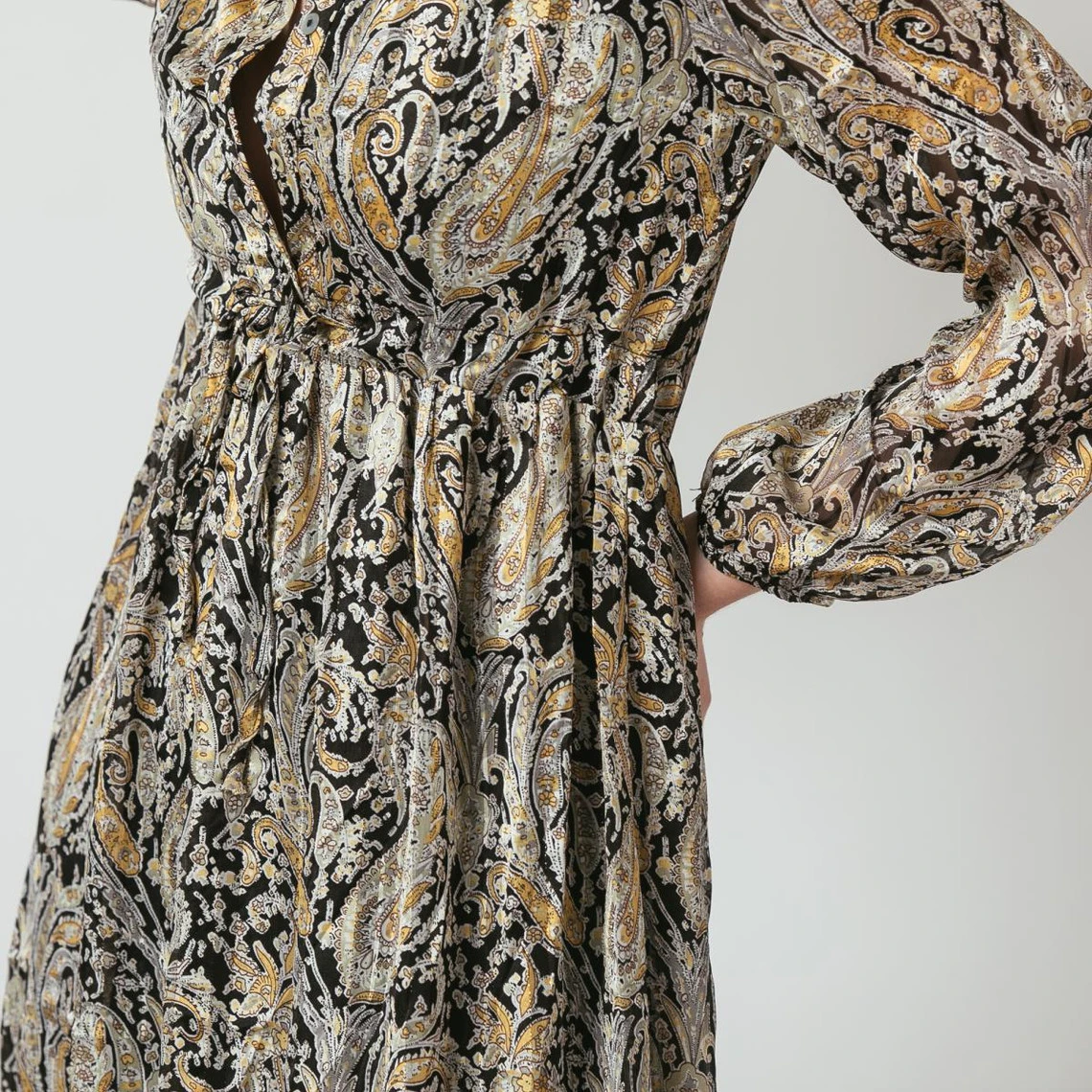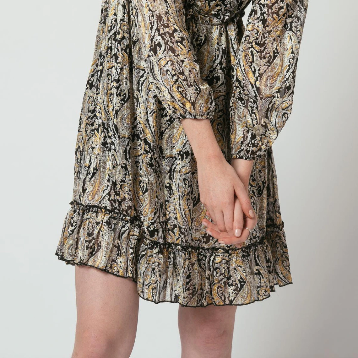 Robe courte à manches longues en cachemire et imprimé dorés sur fond noir.
