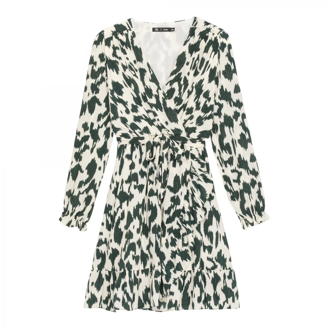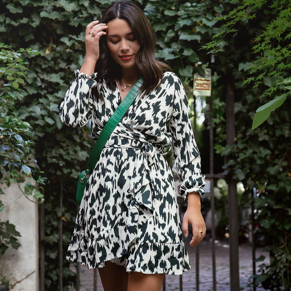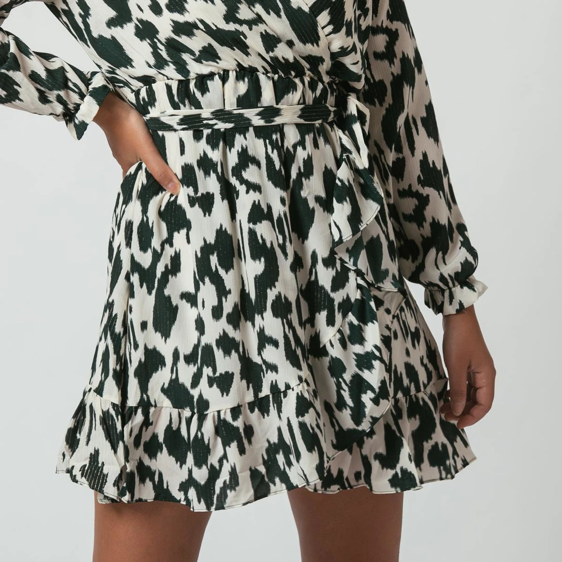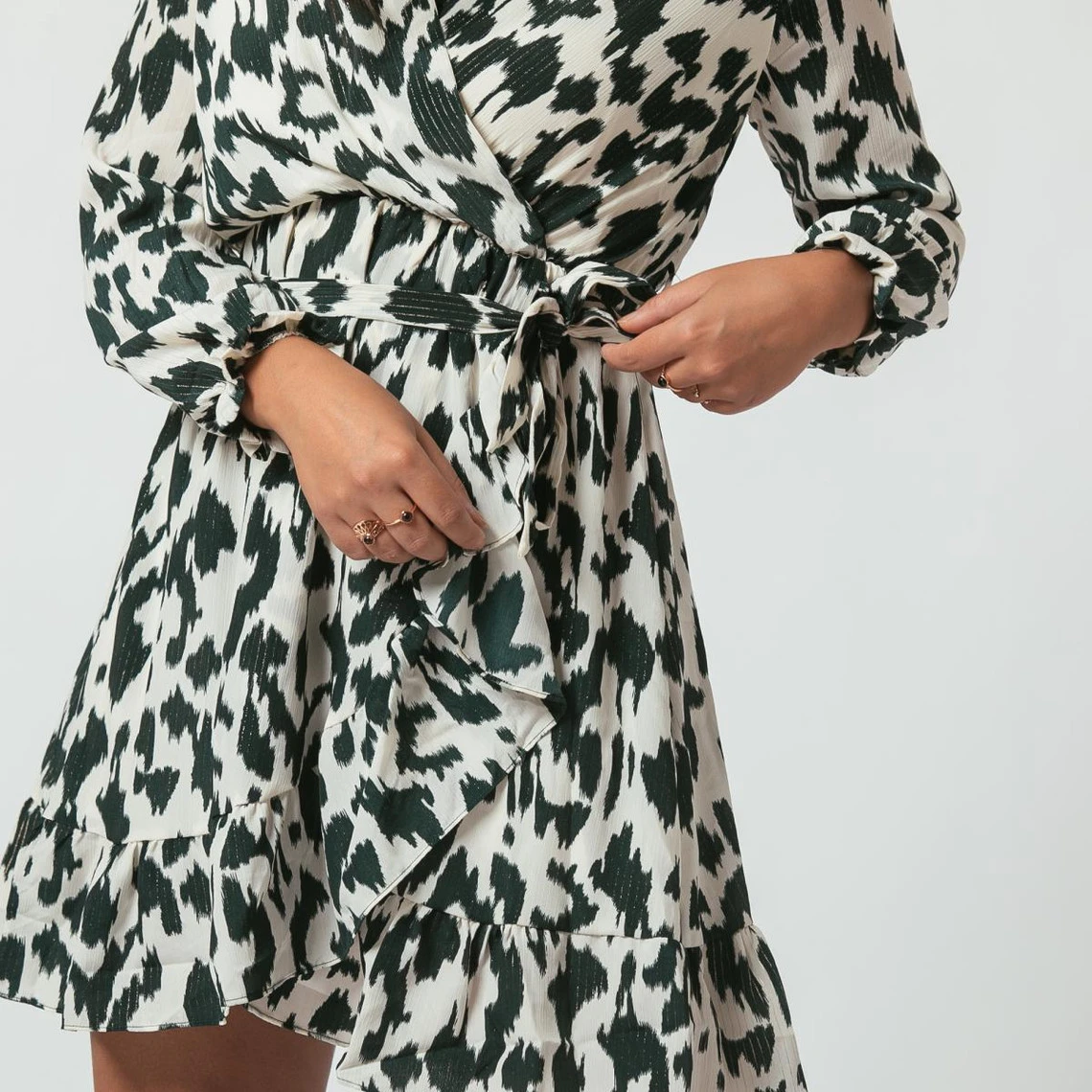 Robe courte croisée à manches longues, blanche avec motif léopard vert.