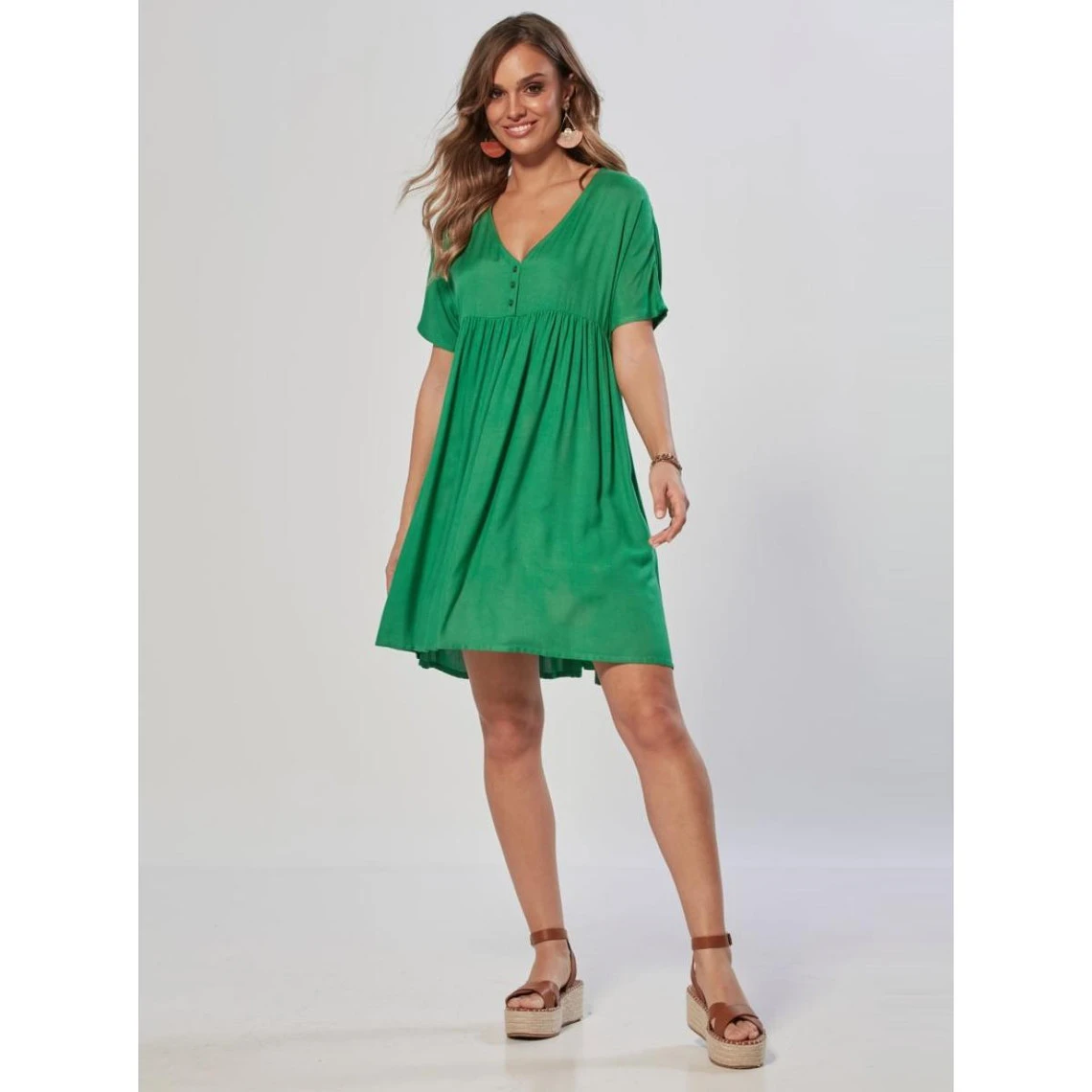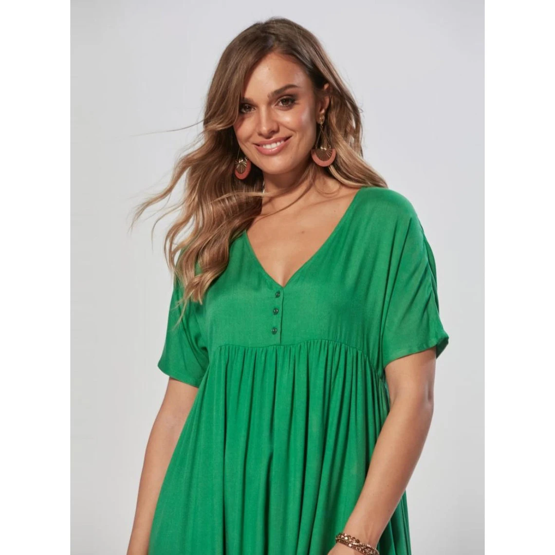 Tendance et chic, découvrez cette Robe oversize froncée, taille empire. Boutonnée, elle propose un col en V et des manches courtes. On aime sa couleur verte et son style froncé.