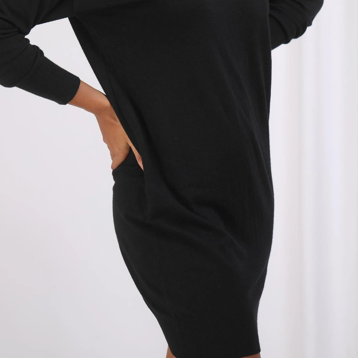 Robe pull ample, maille fine, col montant, finition côtelée, noir.