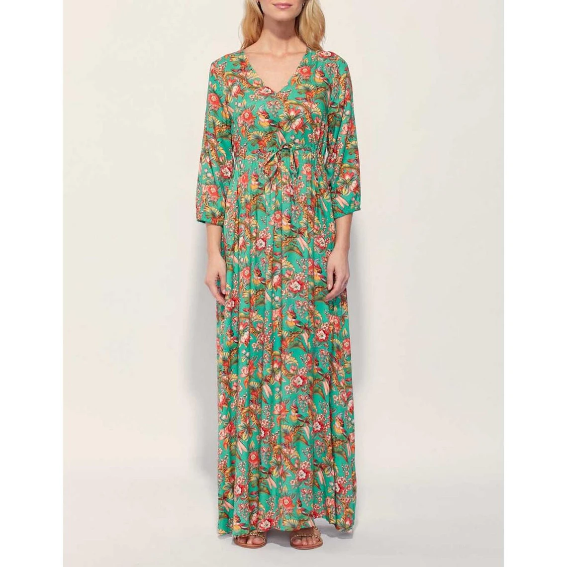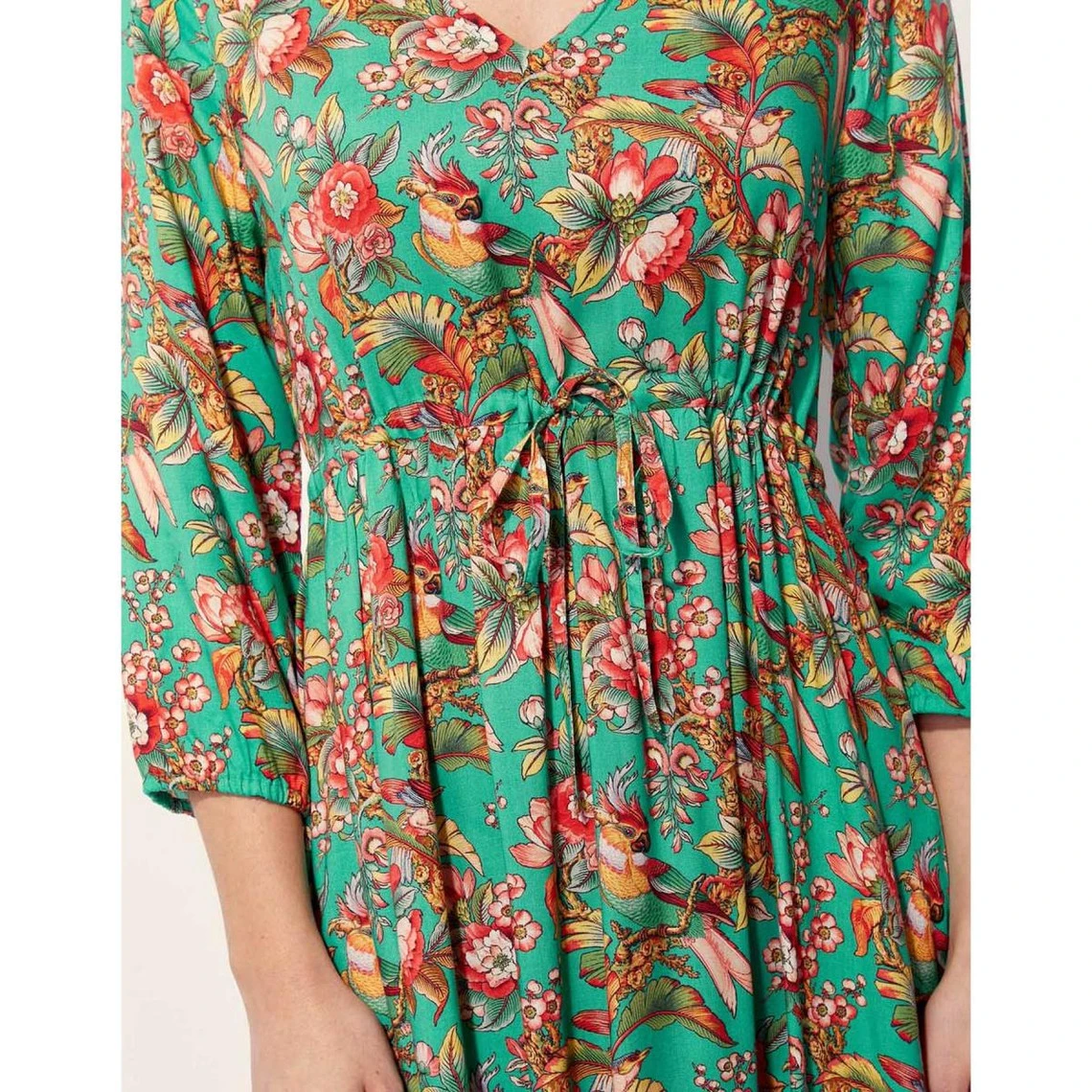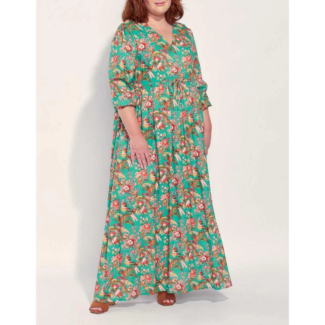 Robe longue femme confortable avec sa matière fluide et douce Ecovero, et aux détails fantaisies tout en féminité avec ses fronces aux épaules et son lien se serrage à la taille haute. Une robe élégante et lumineuse dans un imprimé qui illuminera votre dressing.