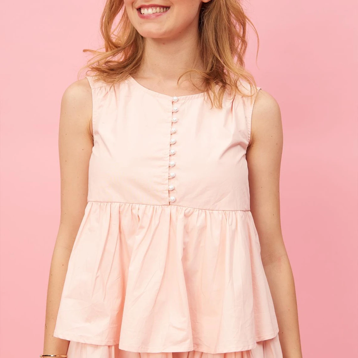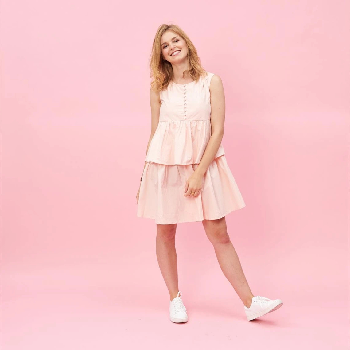 Robe courte sans manche avec volants sous la poitrine et à la taille. Encolure ronde et fermeture par boutons.