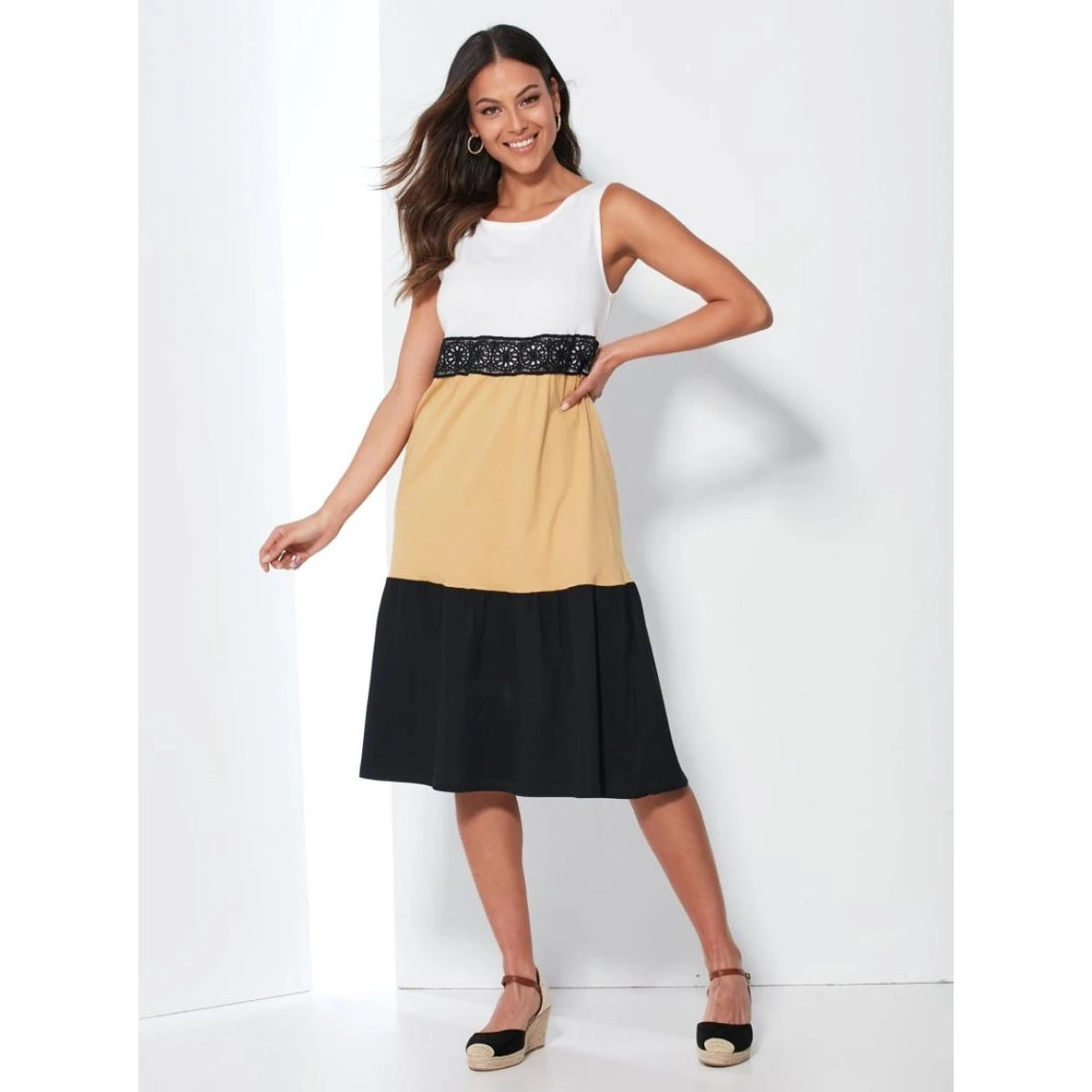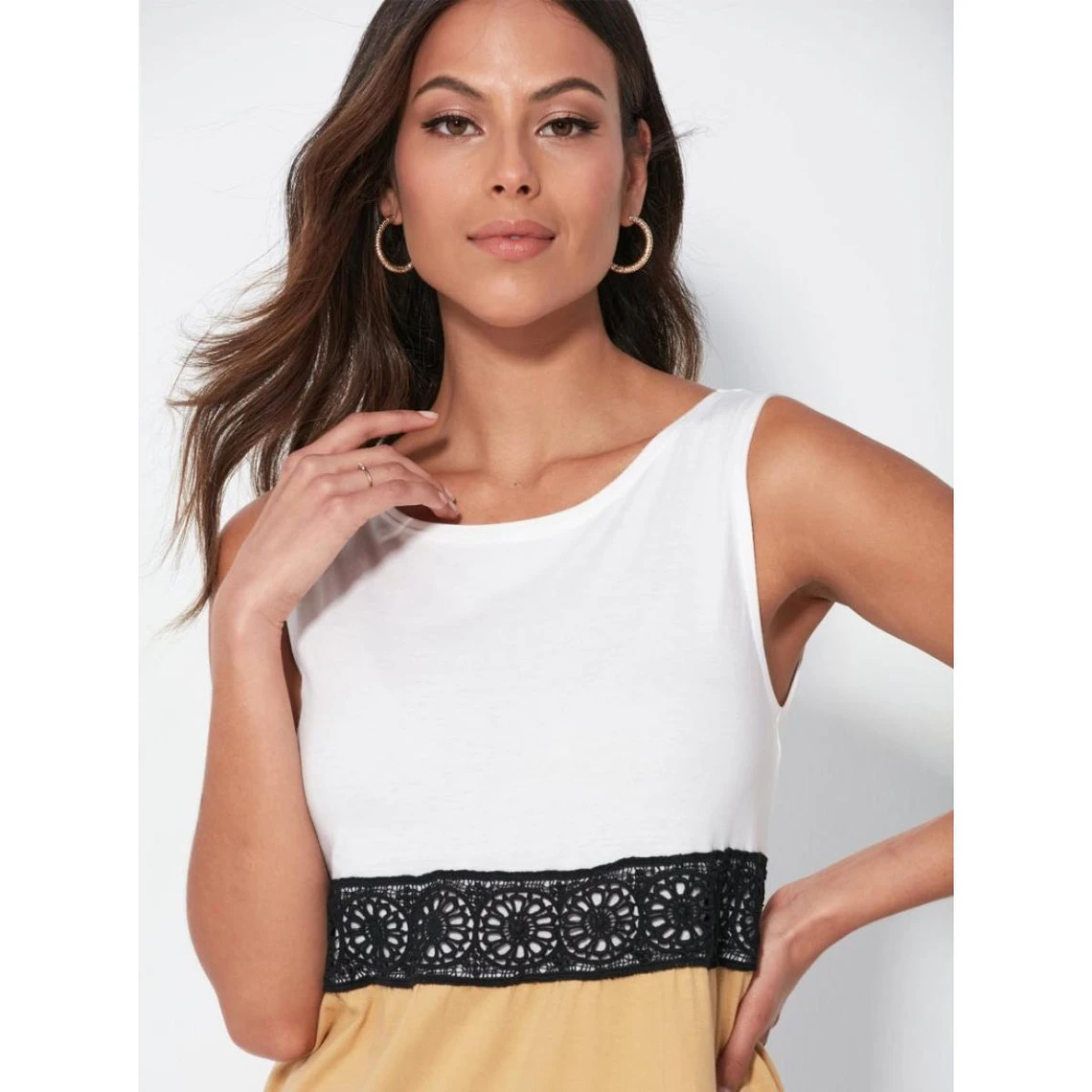 Encolure arrondie Sans manches Pans froncés Bande de guipure sous la poitrine Coupe évasée Maille jersey. 100 % coton. ongueur : 107 cm environ (Traduction Automatique)